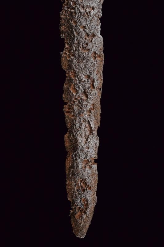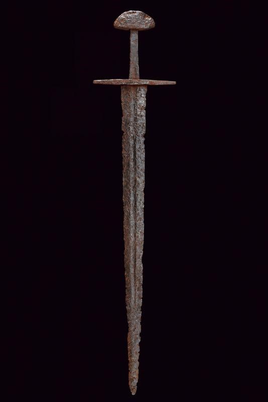 Europa, lunghezza 87,5 cm. XIII Sec. Lama dritta a due fili convergenti, con sguscio centrale che corre per buona parte della lunghezza. Elso in ferro a bracci dritti leggermente rastremati verso le estremità . Codolo di forma quasi rettangolare. Pomo sul tipo a noce di Brasile ma di sezione non particolarmente spessa.