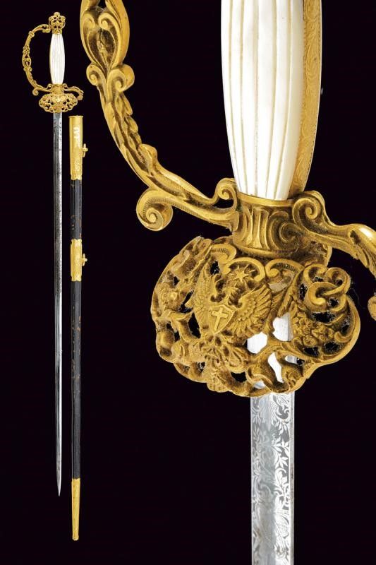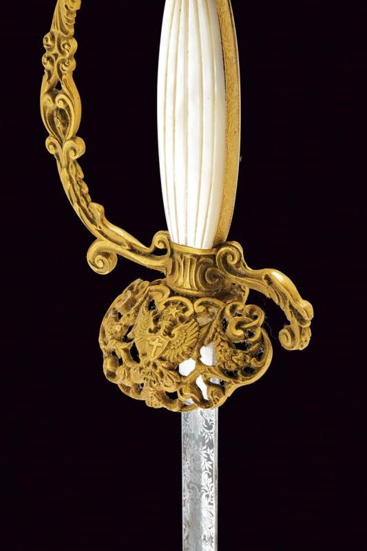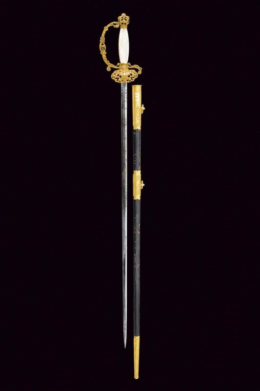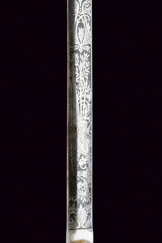 Regno di Sardegna, lunghezza 94,5 cm. Lama dritta di sezione esagonale, incisa al forte a racemi e trofei, con marcatura di Carl Eickhorn di Solingen al tallone. Fornimento in ottone dorato. Con pelta lavorata a traforo e in rilievo, recante l'aquila sabauda sormontata da stella a cinque punte. Anche la guardia con elementi in rilievo e a traforo a motivi di volute e foglie. Pomo con decoro floreale e traforato. Impugnatura con guancette in madreperla. Fodero in cuoio a due campanelle con fornimenti in metallo dorato, incisi a rocaille e fiorami.