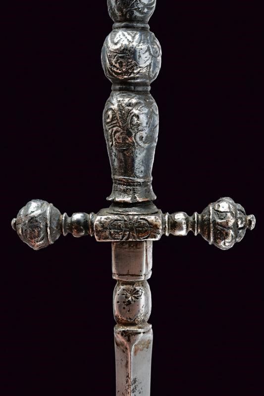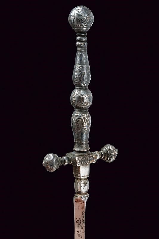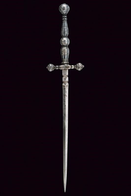 Italia, lunghezza 30.5 cm. XVII Secolo Lama dritta di sezione triangolare con brevissimo tallone. Nodo con punzone. Fornimento in ferro massiccio interamente intagliato a motivi floreali, bracci dell'elso dritti con testa a bocciolo bottonato, impugnatura a doppio balaustro con grosso bottone sferico al centro.