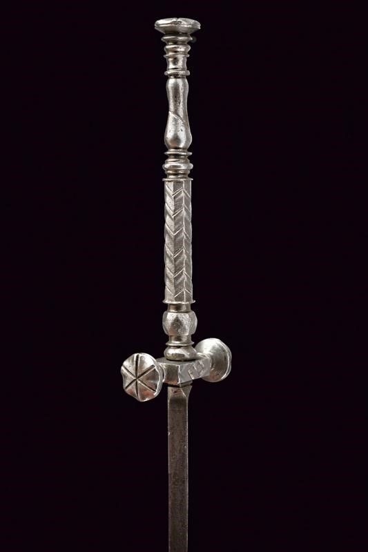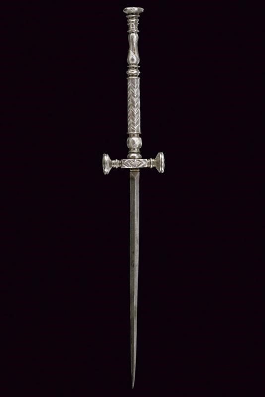 Italia, lunghezza 21.5 cm. XVII Secolo Lama dritta di sezione triangolare. Fornimento in ferro massiccio, brevi bracci dell'elso dritti dotati di testa a disco con dorso inciso a raggi; massello rettangolare lievemente inciso. Impugnatura incisa con bande a zig-zag. Pomo en suite con l'estremità dei bracci dell'elso.