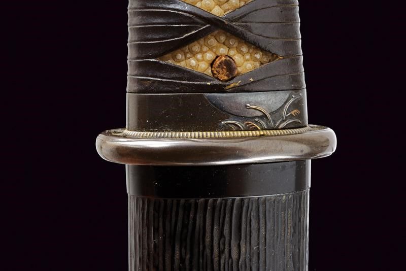 Periodo Muromachi (1392-1573) Nagasa 30.2 cm. Hamon: Hoso Suguha; hada: Itame Masame, doppio habaki in rame; Nakago mei 'Kanewara', Ubu Kurijiri; Yasuri Higaki. Bellissima koshirae con tsuba ovale in shakudo, fuchi decorato con erba sotto la luna, kashira con volatili, sempre in bassorilievo parzialmente in oro ed argento. Eleganti menuki in shakudo annerito e dorato decorati a motivi floreali. Tsuka in pelle. Saya in legno laccata e decorata a sottili scanalature simili alla struttura di legno, bellissimo Kurigata in rame a lavorato a effigiare un edificio, con decorazioni floreali parzialmente dorate. Tardo Periodo Muromachi - inizio Tensho (circa 1573), scuola Minoseki, gruppo Shizo Saburo. Kanewara lavorava come Wakasa No Jo Ujifusa.