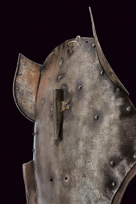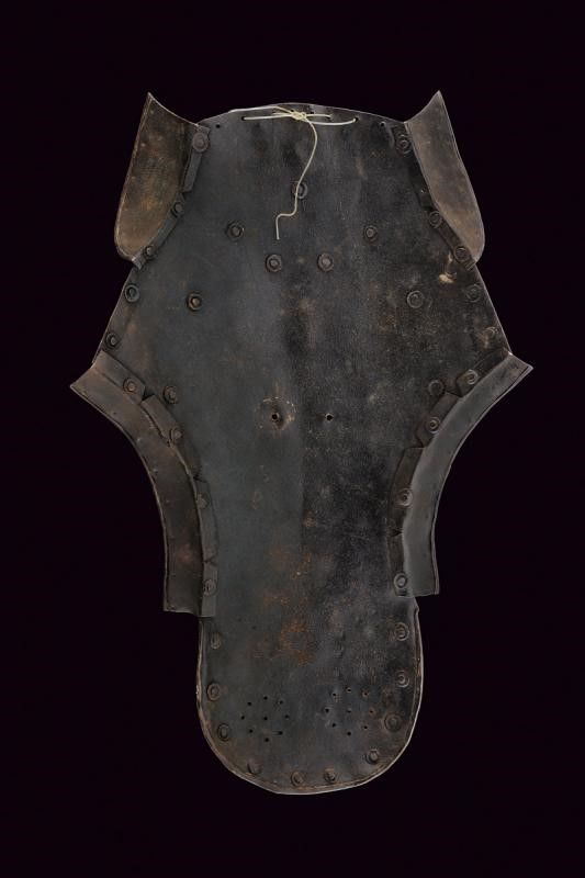 Europa, altezza 48,5 cm. In ferro, di forma ben modellata, completa di paraorecchie e altre lamine fissate con ribattini. Al centro una pennacchiera. La parte anteriore con fori aeratori. Bordi parzialmente orlati e incisi. In alto un punzone a scudo caricato con lettera 'W' e resti di altri tre marchi.