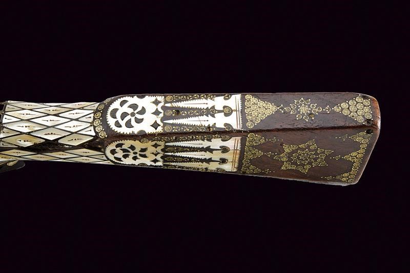 Bulgaria, lunghezza 95,5 cm. XIX Secolo Canna tonda liscia (accorciata), con culatta munita di alzo ben rilevato e argentato. In volata cal. 14 mm. Codolo con tracce di lamina in argento (quasi completamente mancante). Batteria alla micheletta con cane di tipica forma a dorso tondeggiante; anche questa recante resti di lamine in argento, incise a motivi floreali. Grilletto sferoide in ferro. Meccanica da rivedere. Cassa in legno (accorciata) con calcio a sezione pentagonale e sottile. Il segmento centrale riccamente ornato con tarsie in madreperla a rombi (in buona parte presenti) e parzialmente incise. Il collo sempre con tarsie in madreperla a rombi che poi assumono forme più elaborate e sono anche traforate. Il resto della cassa ornato per buona parte con il tipico decoro ad agemine in ottone a dischetti smaltati, anche questi conservati in buona parte. Il lato sinistro dotato di due passanti snodati. Bacchetta mancante.