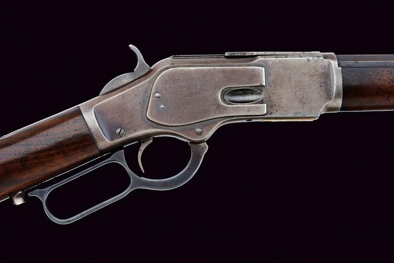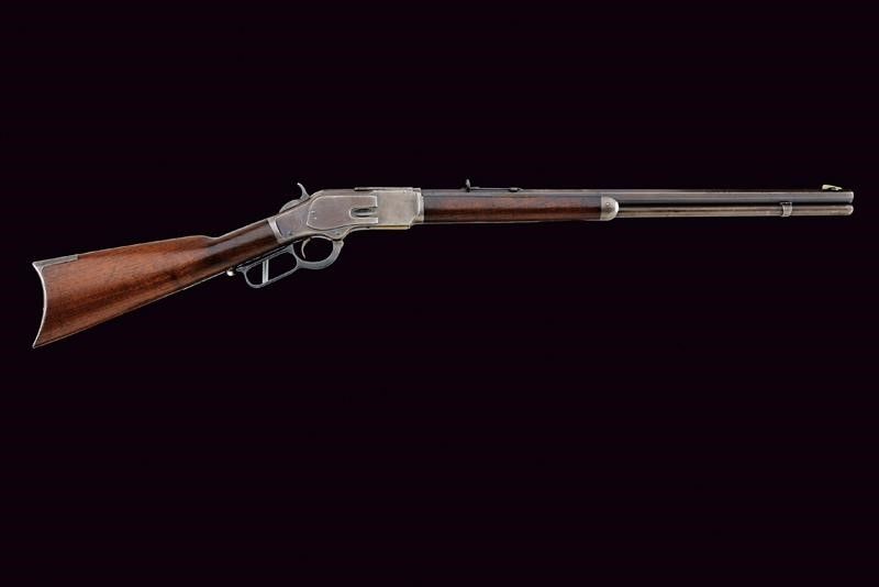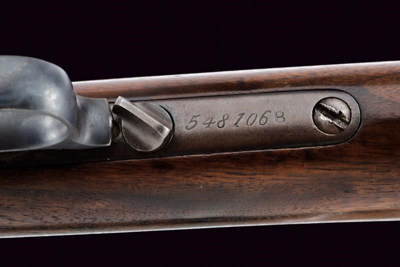 Terzo quarto del XIX Secolo Canna rigata tonda, dotata di mirino ed alzo regolabile, marcata con indirizzo della ditta, con 'KING'S IMPROVEMENT' e brevetti fino al 1860, marcatura del calibro '38 W.C.F.' Anima con un po' di pitting e rigatura visibile. Castello con codolo superiore recante dicitura del modello, quello inferiore con matr. '548xxx B'. Carrello elevatore in ottone, marcato '38 CAL.' Meccanica funzionante. Calcio ed astina in noce, entrambi lisci. Fornimenti in ferro. Calciolo liscio del tipo con sportellino. Tracce di brunitura antica.