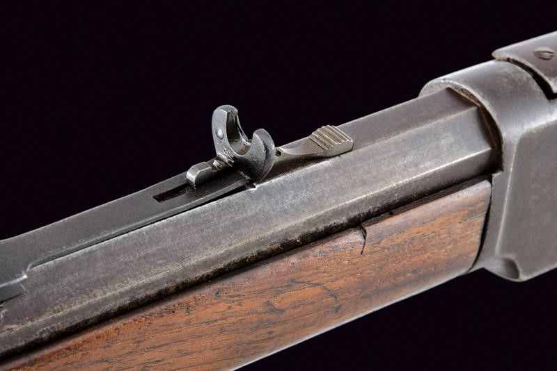 1875-1890 Canna rigata ottagonale, dotata di mirino ed alzo regolabile, marcata con indirizzo della ditta, con 'KING'S IMPROVEMENT' e brevetti fino al 1860, marcatura del calibro '44 W.C.F.' Anima con pitting e rigatura ben visibile. Castello con codolo superiore recante dicitura del modello, quello inferiore con matr. '366xxx B'. Carrello elevatore in ottone. Meccanica funzionante, sportellino dell'estrattore da rivedere in quanto presenta dei problemi di scorrimento. Calcio ed astina in noce, entrambi lisci. Fornimenti in ferro. Calciolo liscio, con sportellino in ottone, bacchetta presente. Terzo modello.