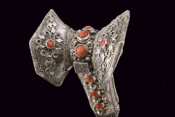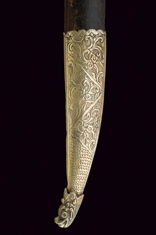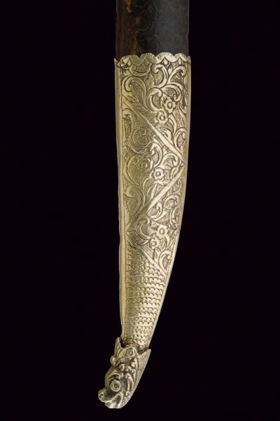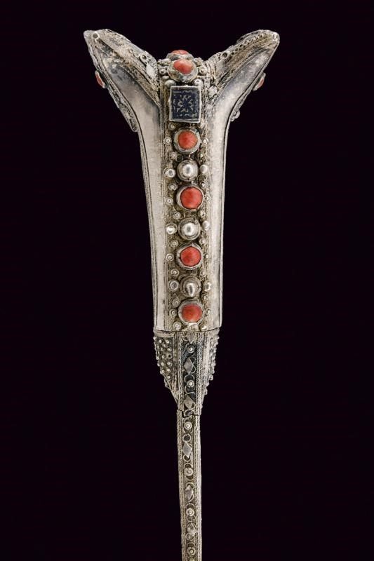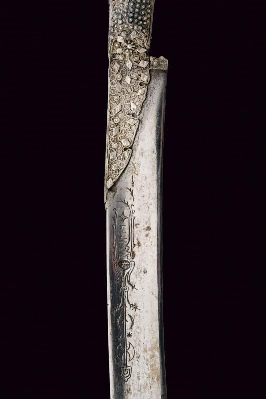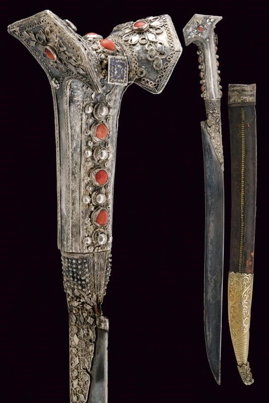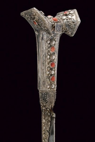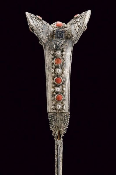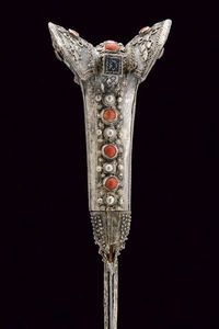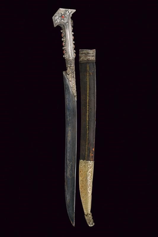 Turchia, lunghezza 57.7 cm. XIX Secolo Lama leggermente curva a un filo, recante sul lato di terza punzone arabo e data '1216' in arabo. Bellissimo fornimento completamente in argento, riccamente decorato in filigrana e con pietre rosse a cabochon. Fodero in legno rivestito di cuoio (mancanze) e cucito in filo metallico, semplice cappa in metallo, il puntale in metallo giallo con estremità a testa di mostro.