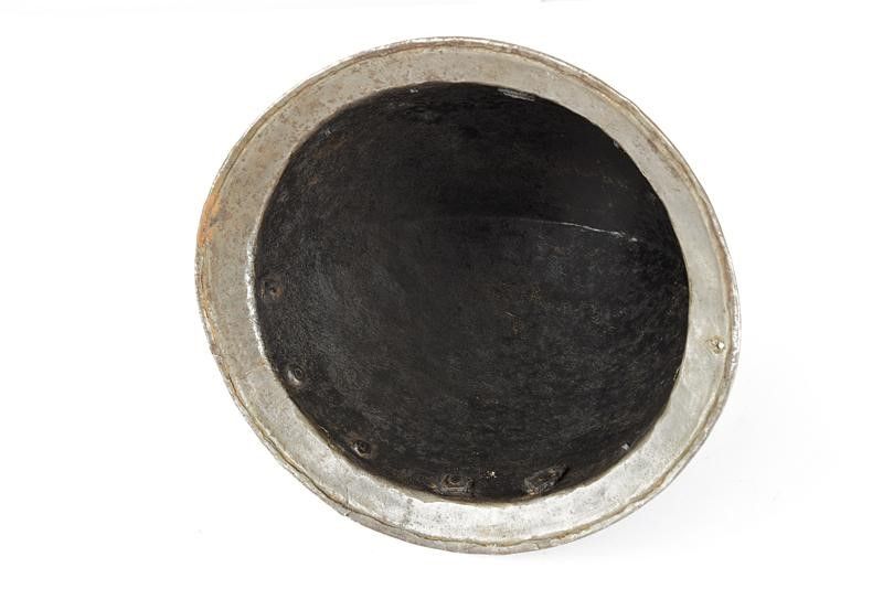 Italia, altezza 18 cm. Fine del XVI Secolo Coppo in un solo pezzo, costolato in mezzeria e con apice girato all'indietro, recante alla base un giro di rivetti con rosette in ottone (mancanze); breve tesa leggermente spiovente con margine ribassato e bordo cordonato liscio. Manca la pennacchiera.