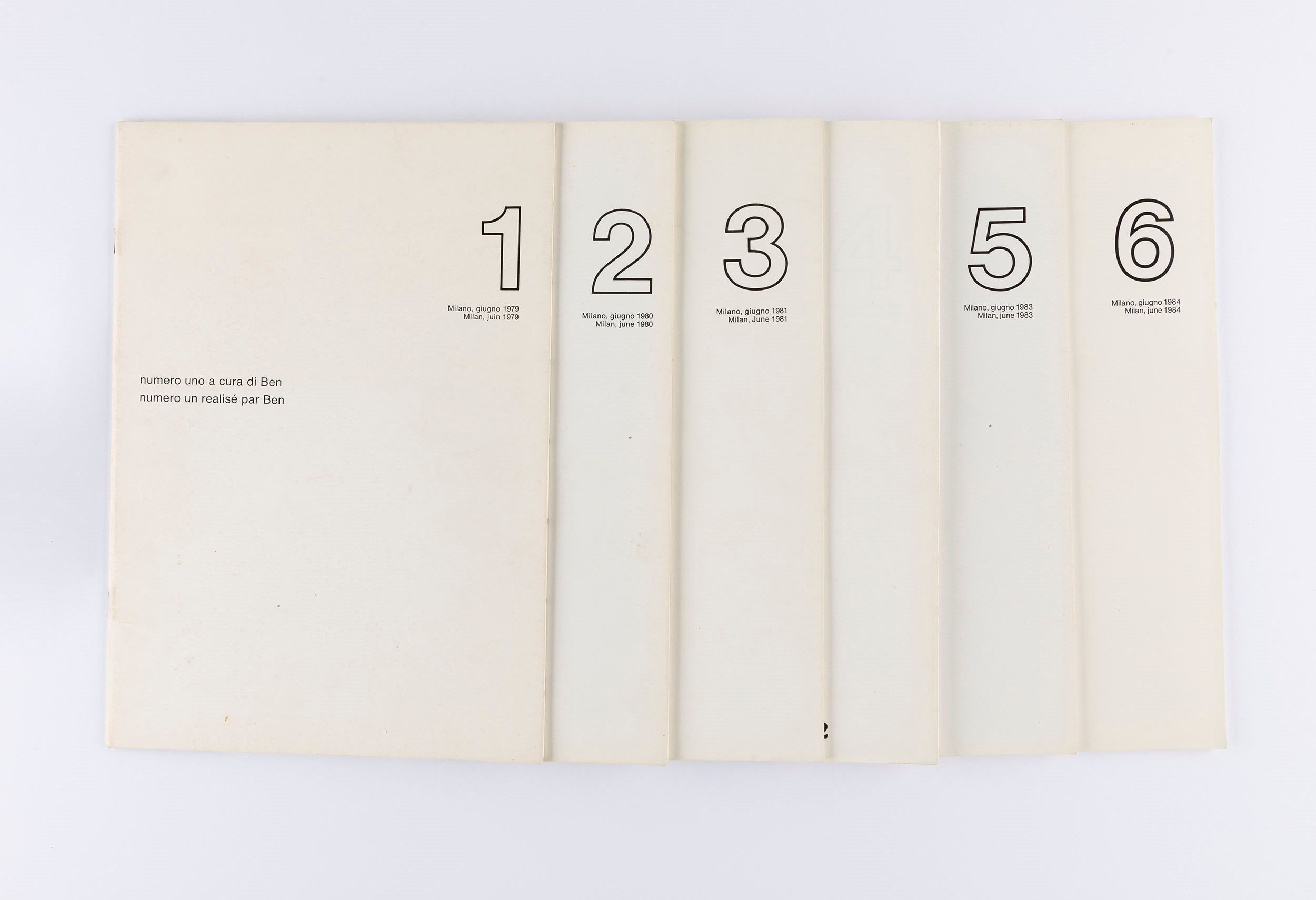 cm 30 x 21 cad. 1979-1984 N. 1 a cura di Ben, giugno 1979 N. 2 a cura di Bernar Venet, giugno 1980 N. 3 a cura di Vincenzo Accame, giugno 1981 N. 4 a cura di Sol Le Witt, giugno 1982 N. 5 a cura di Giuseppe Panza di Biumo, giugno 1983 N. 6 a cura di Arturo Schwarz, giugno 1984 Editore Cenobio Visualità , Milano