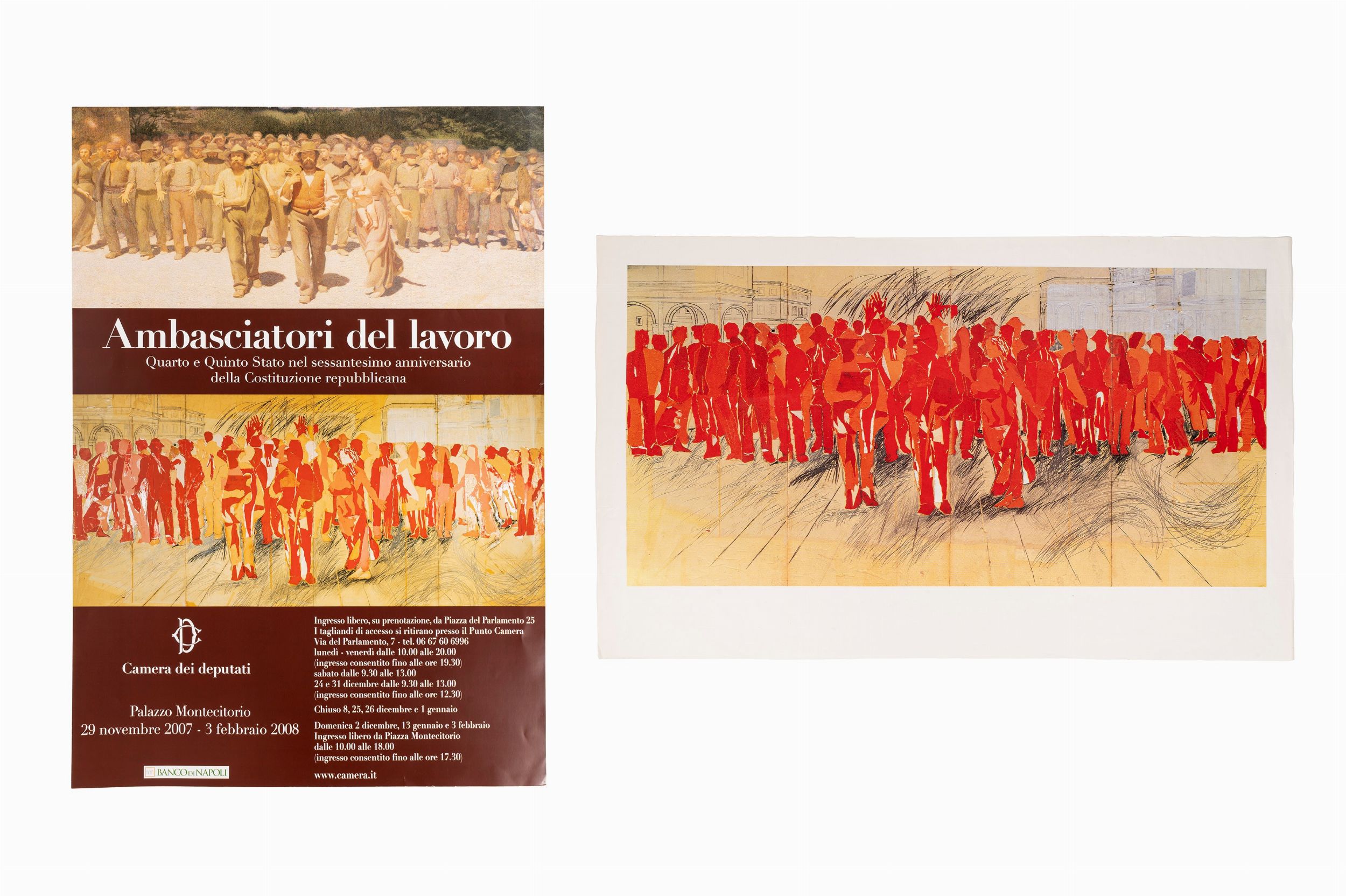 a) Manifesto per la Camera dei deputati, Ambasciatori del lavoro. Quarto e Quinto Stato nel sessantesimo anniversario della Costituzione repubblicana , 2007, cm 98,5 x 68,5, (sc) b) Manifesto per il Quinto Stato, cm 60,5 x 100, (sc)