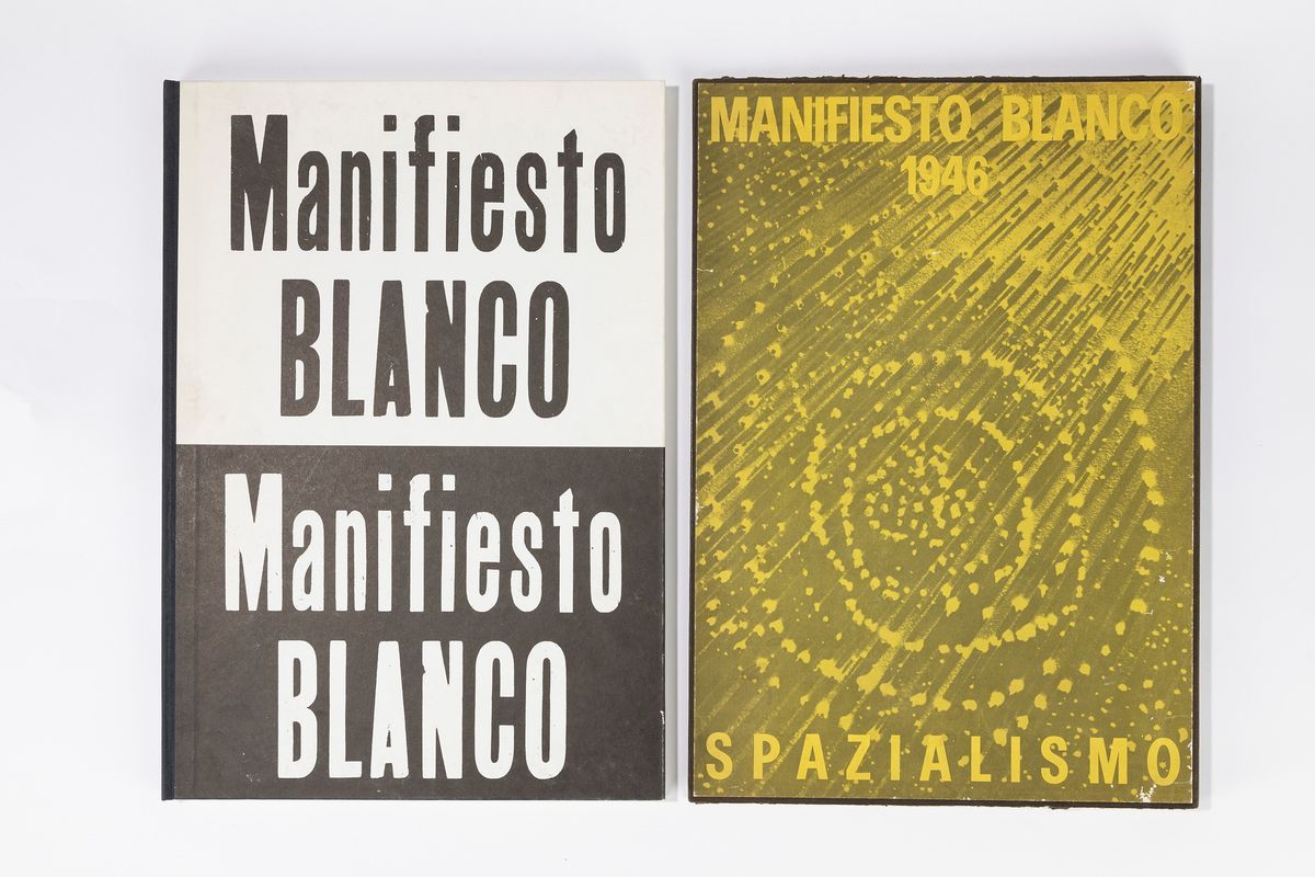 Edizione speciale del Manifesto Blanco pubblicato a Buenos Aires nel 1946 dal quale nacque lo Spazi, cm 48 x 33 (misure della custodia) 1946/66 Entro cofanetto originale Opera realizzata in 2000 esemplari dalle Edizioni Galleria Apollinaire, Milano, nel 1966, curata da Guido Le Noci e Ugo Mulas