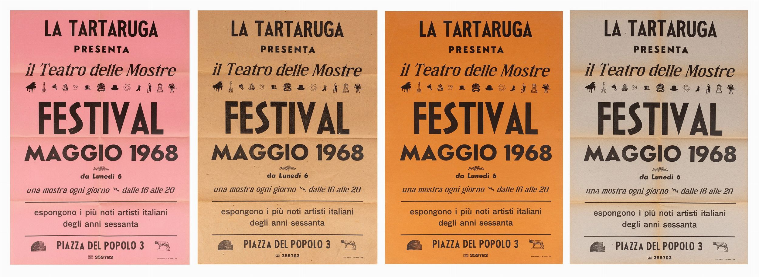 Festival maggio 1968, quattro manifesti della celebre mostra alla galleria La Tartaruga, Roma, maggio 1968, ciascuno di colore diverso, cm 70 x 50, (sc)