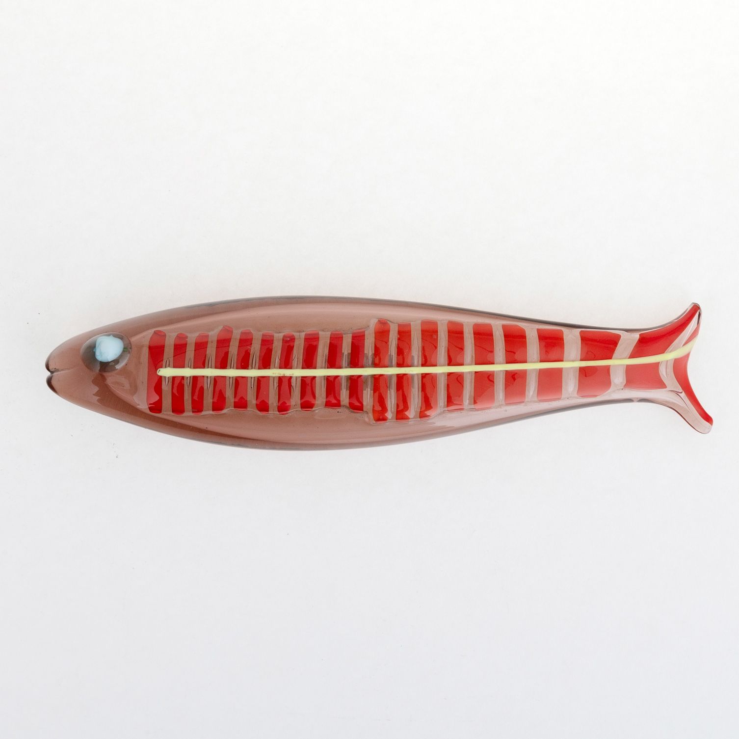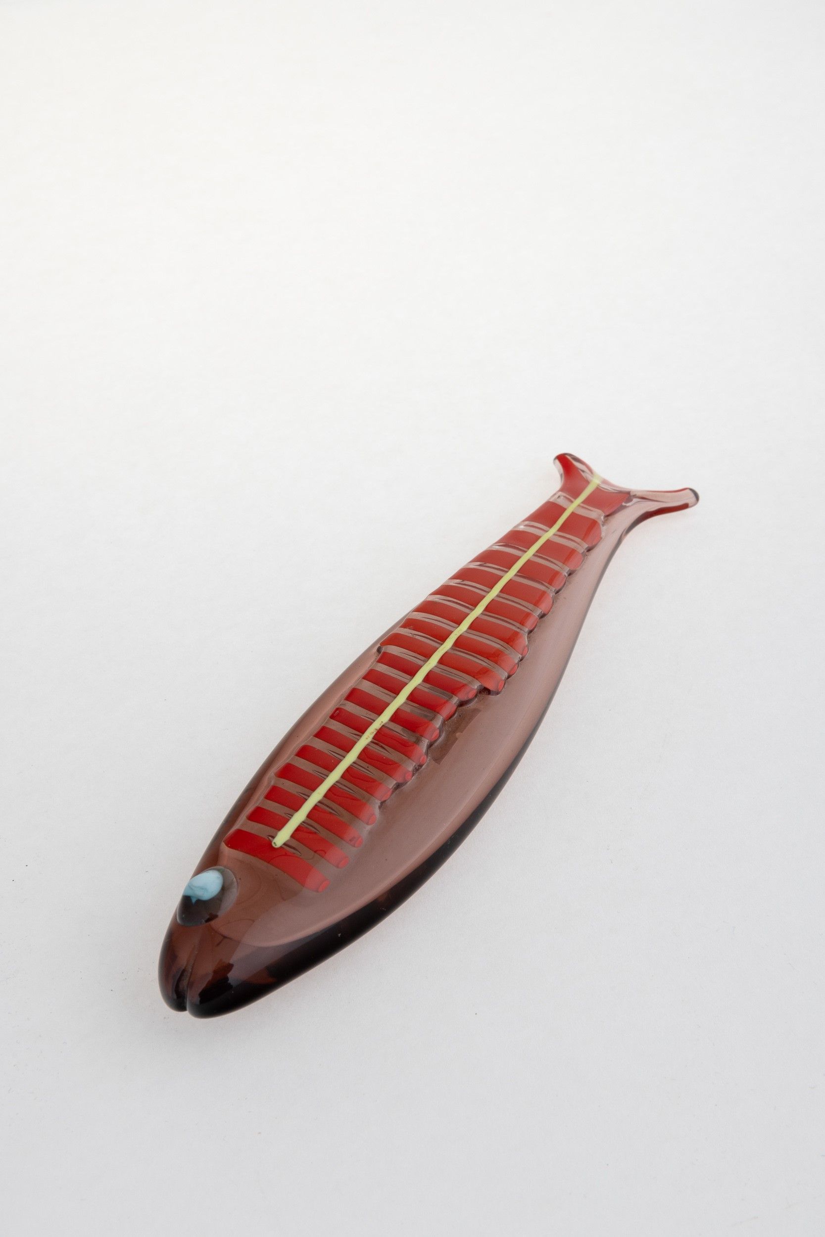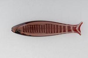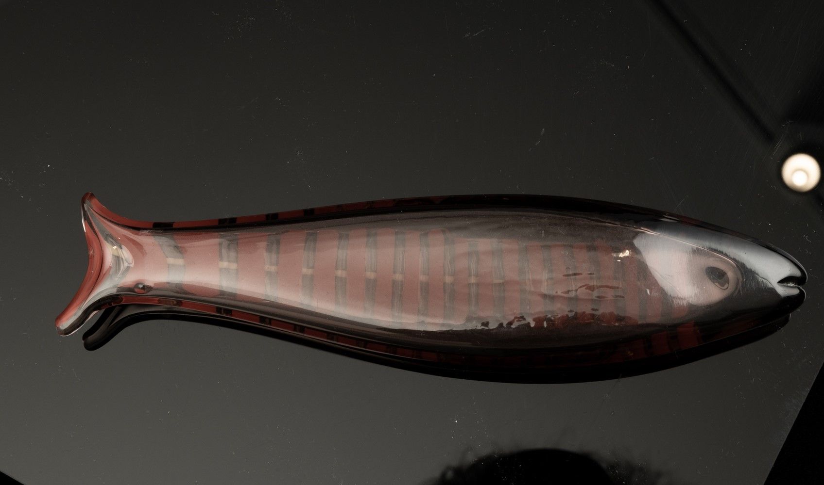 Soprammobile in forma di pesce in vetro trasparente con decoro di canne policrome. Sbeccature.
