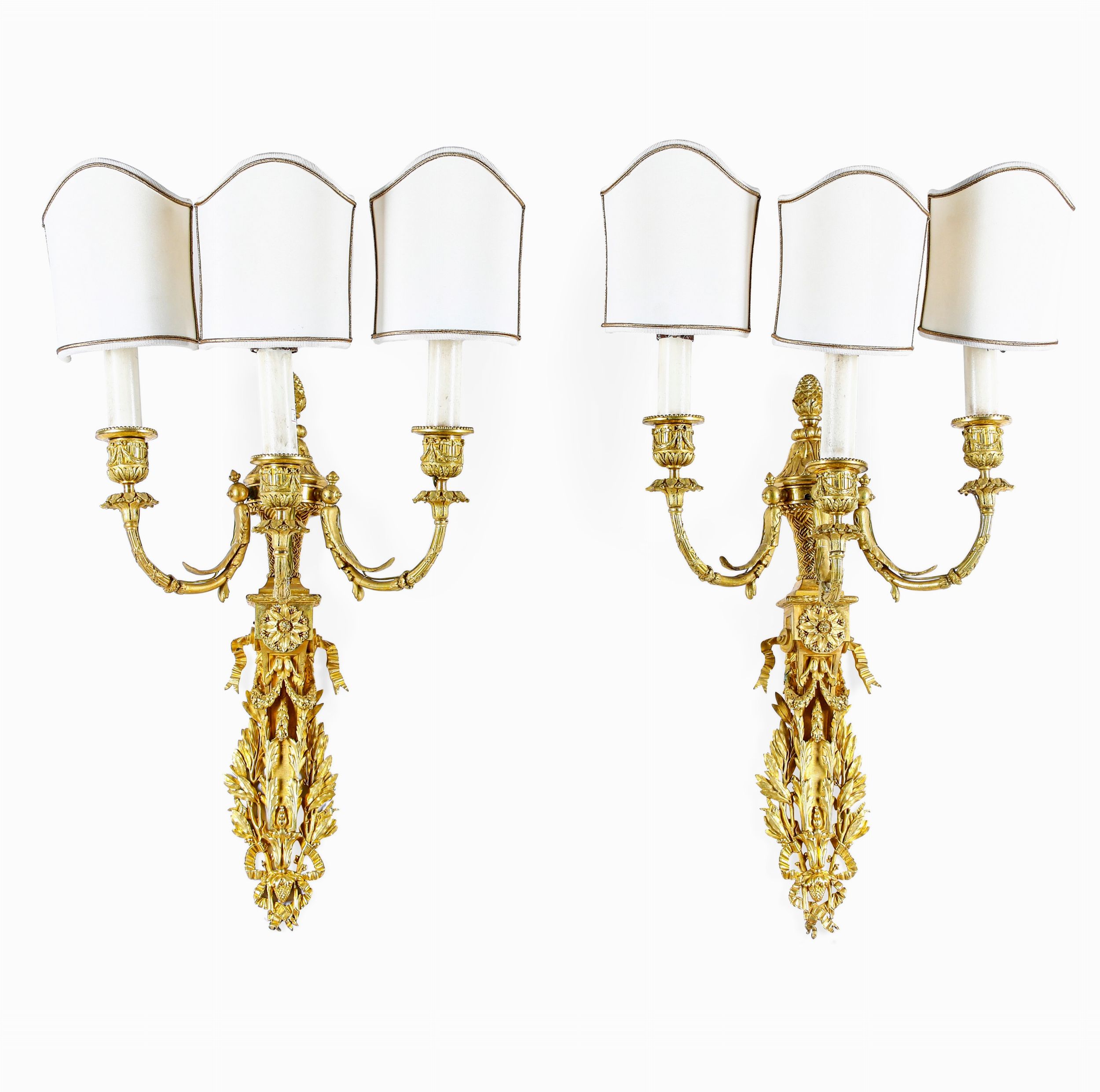 Coppia di appliques a tre luci in bronzo dorato e cesellato. XIX-XX secolo