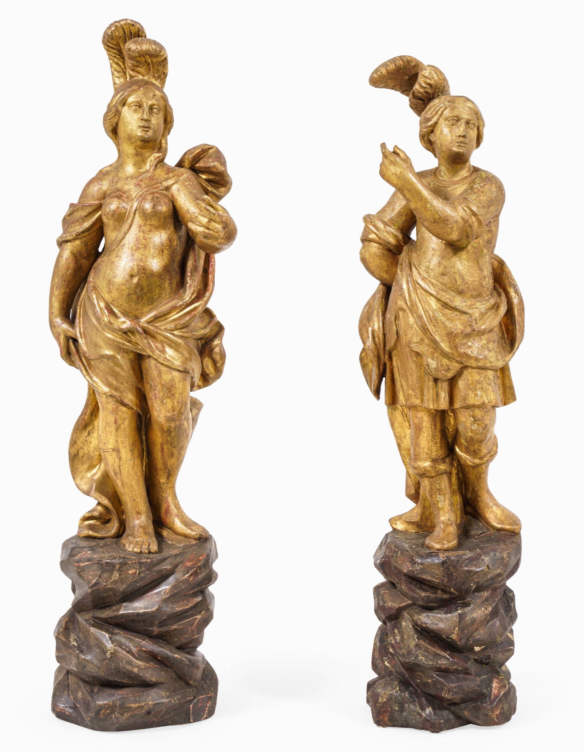 Coppia di sculture con figura maschile e femminile abbigliati all'antica con copricapi [..]