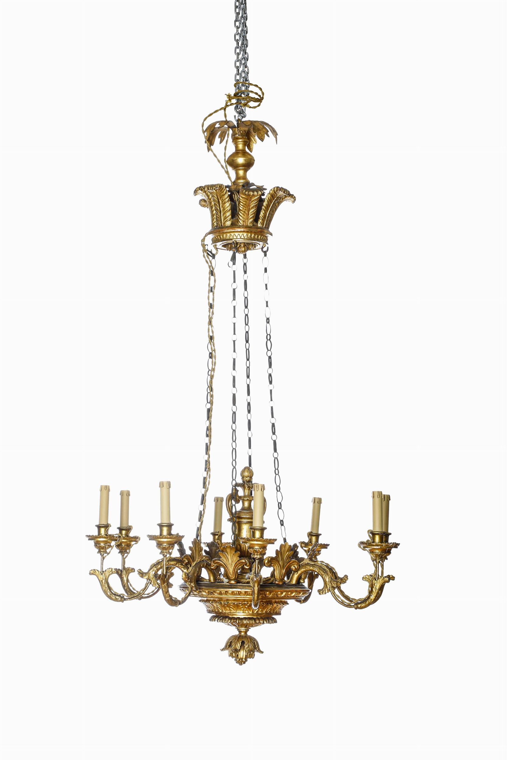 Lampadario a otto luci in legno intagliato e dorato. Francia, XVIII-XIX secolo
