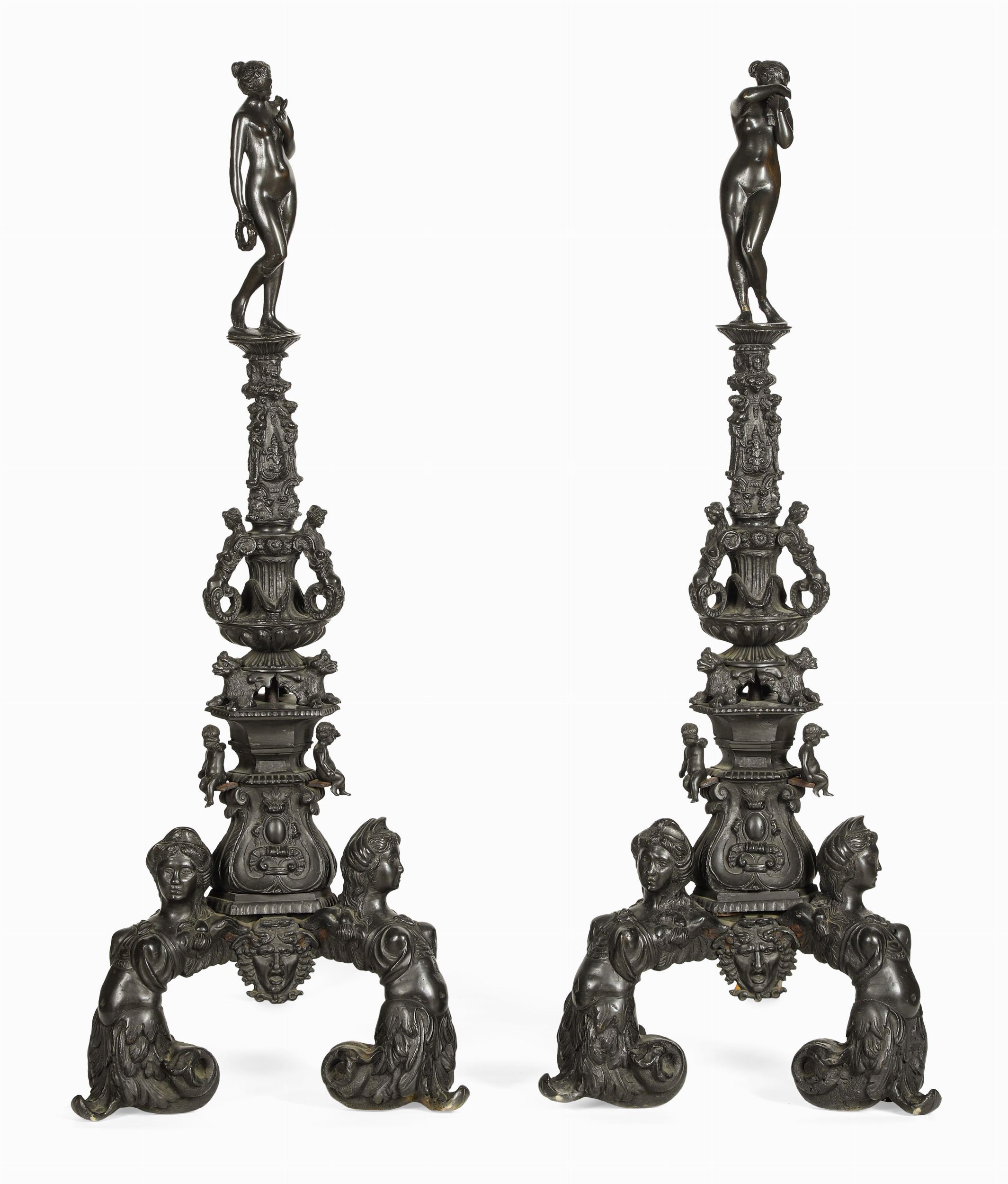Monumentale coppia di alari. Fonditore italiano del XVIII secolo. Nei modi della [..]