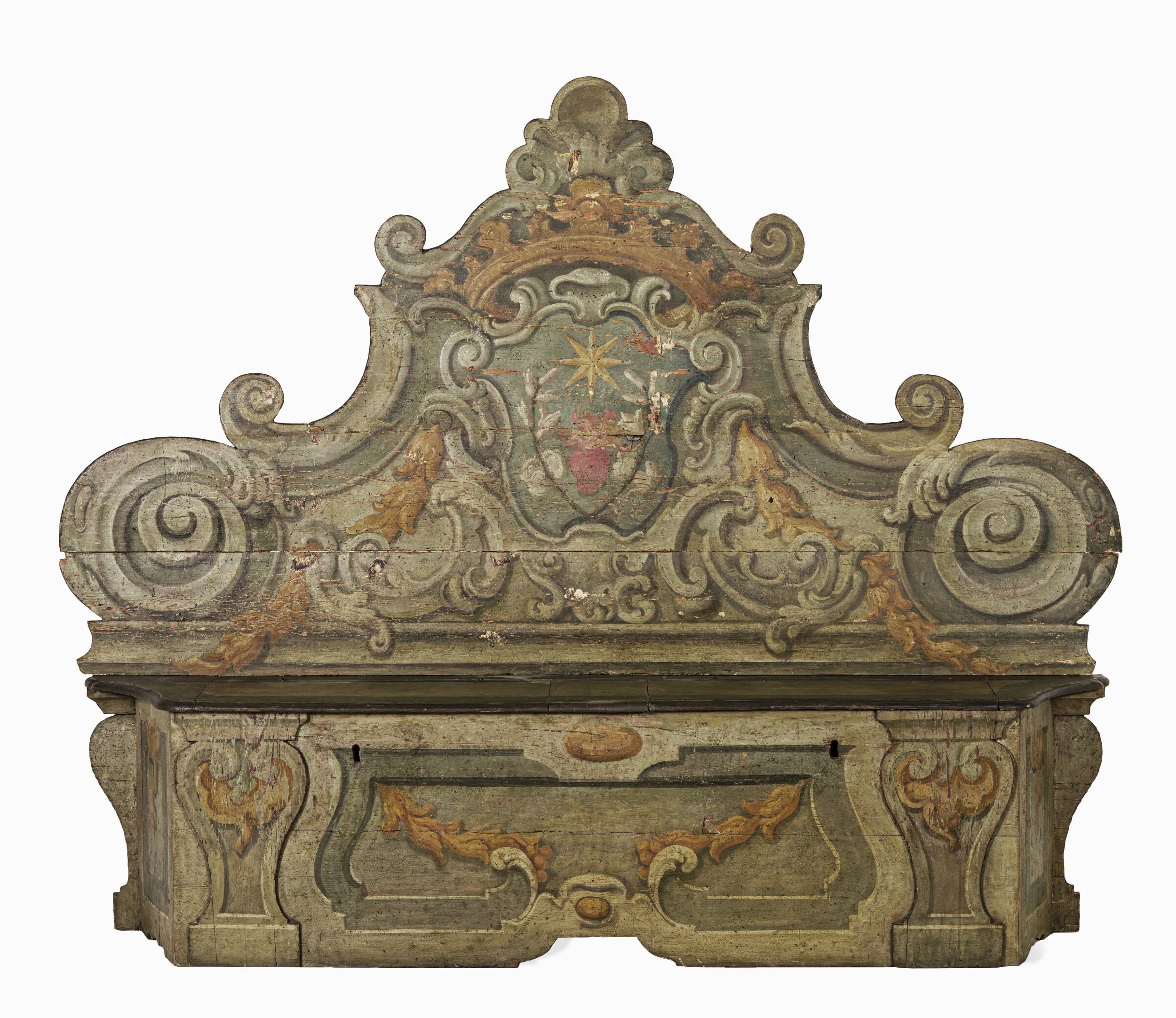 Panca da ingresso in legno laccato. Italia XVII-XVIII secolo