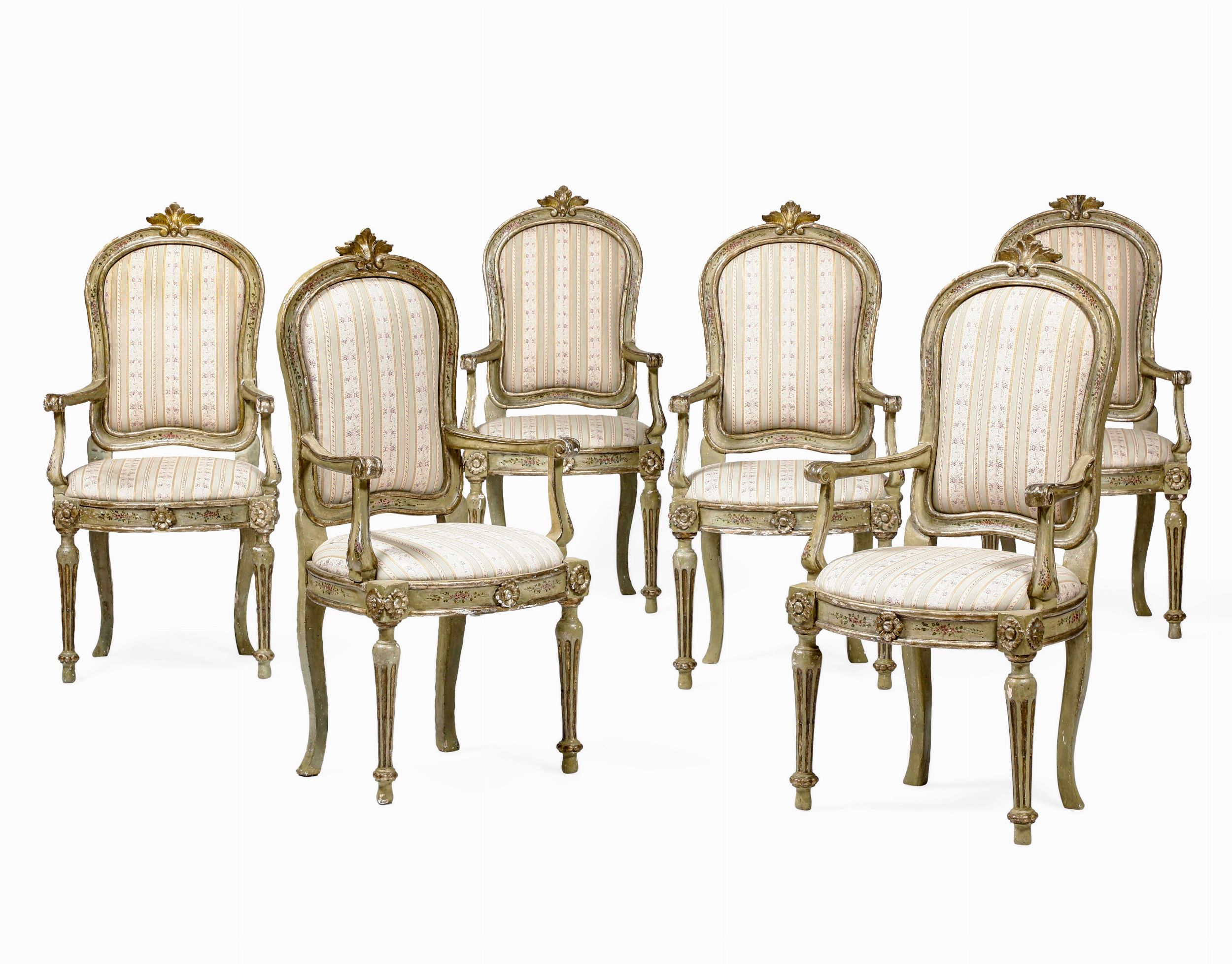 Sei poltrone in legno laccato e dorato. XVIII secolo