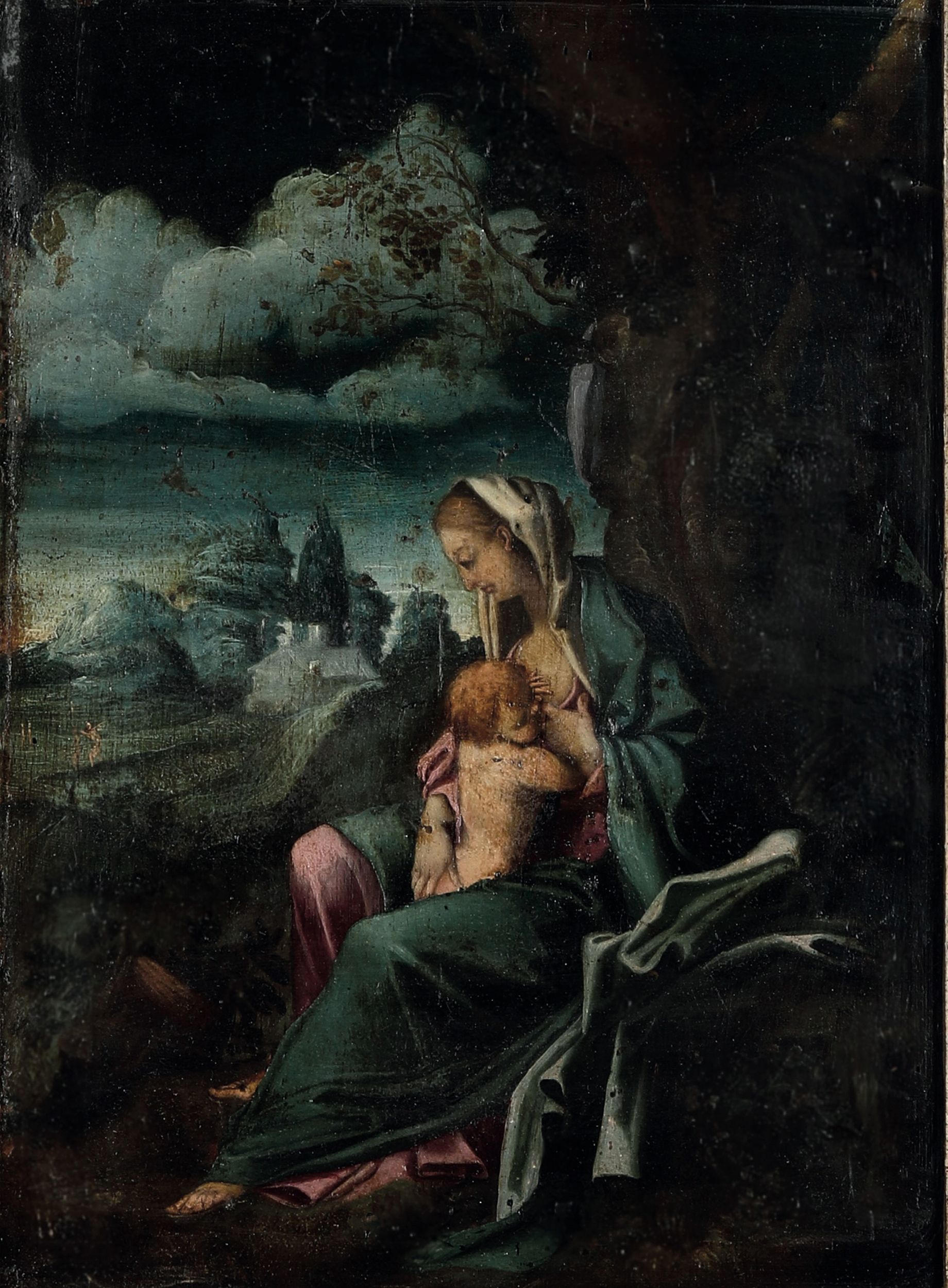 Scuola del XVII secolo Madonna con Bambino in paesaggio