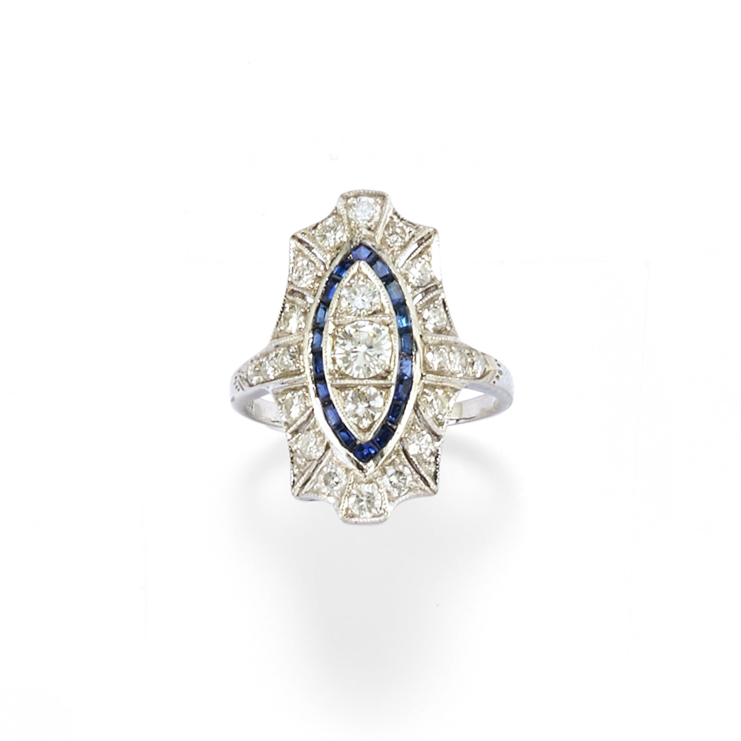 in stile decò, con diamanti taglio brillante per totale ct 1,00 circa e pietre blu taglio fantasia.