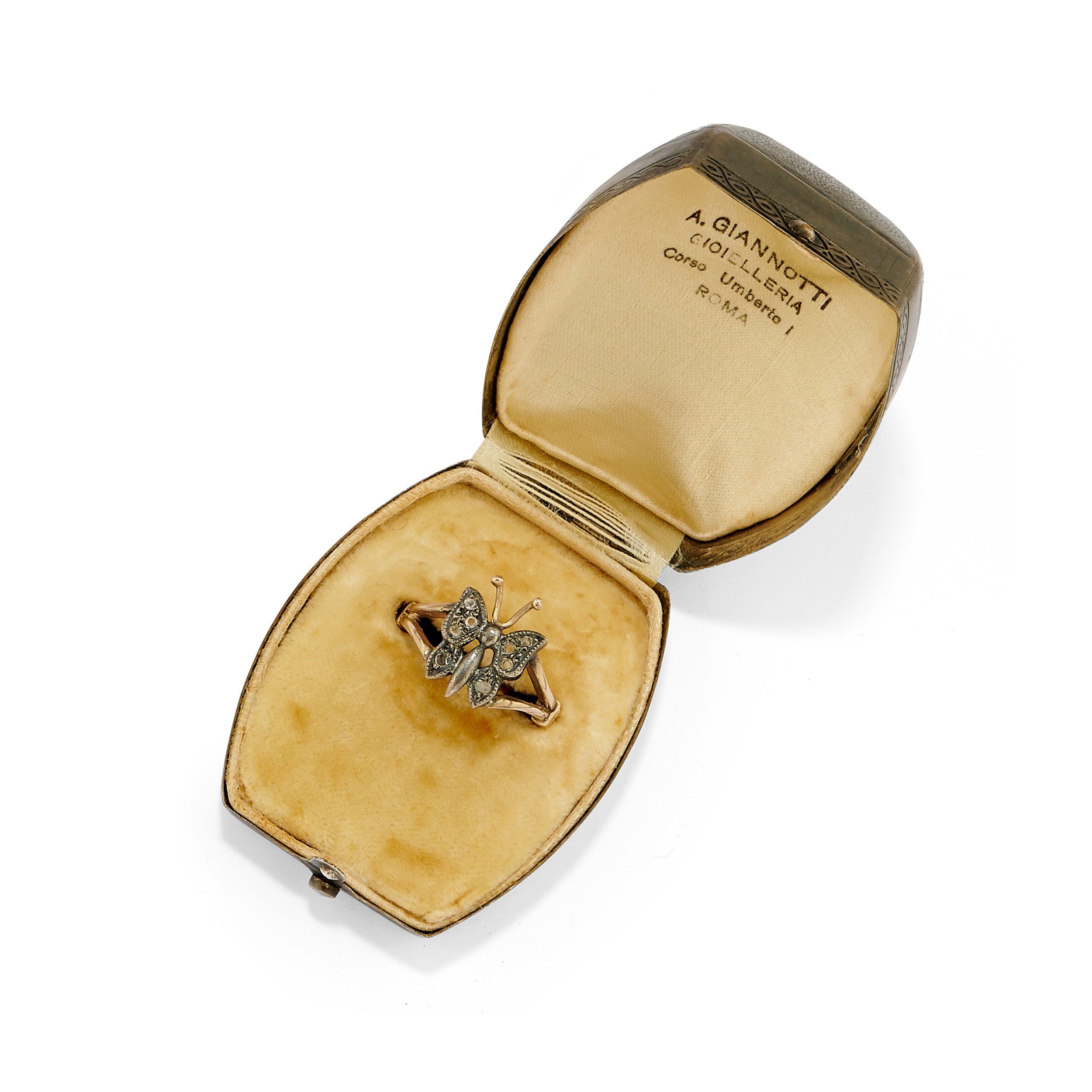 a forma di farfalla con piccoli diamanti taglio rosa, con scatola.