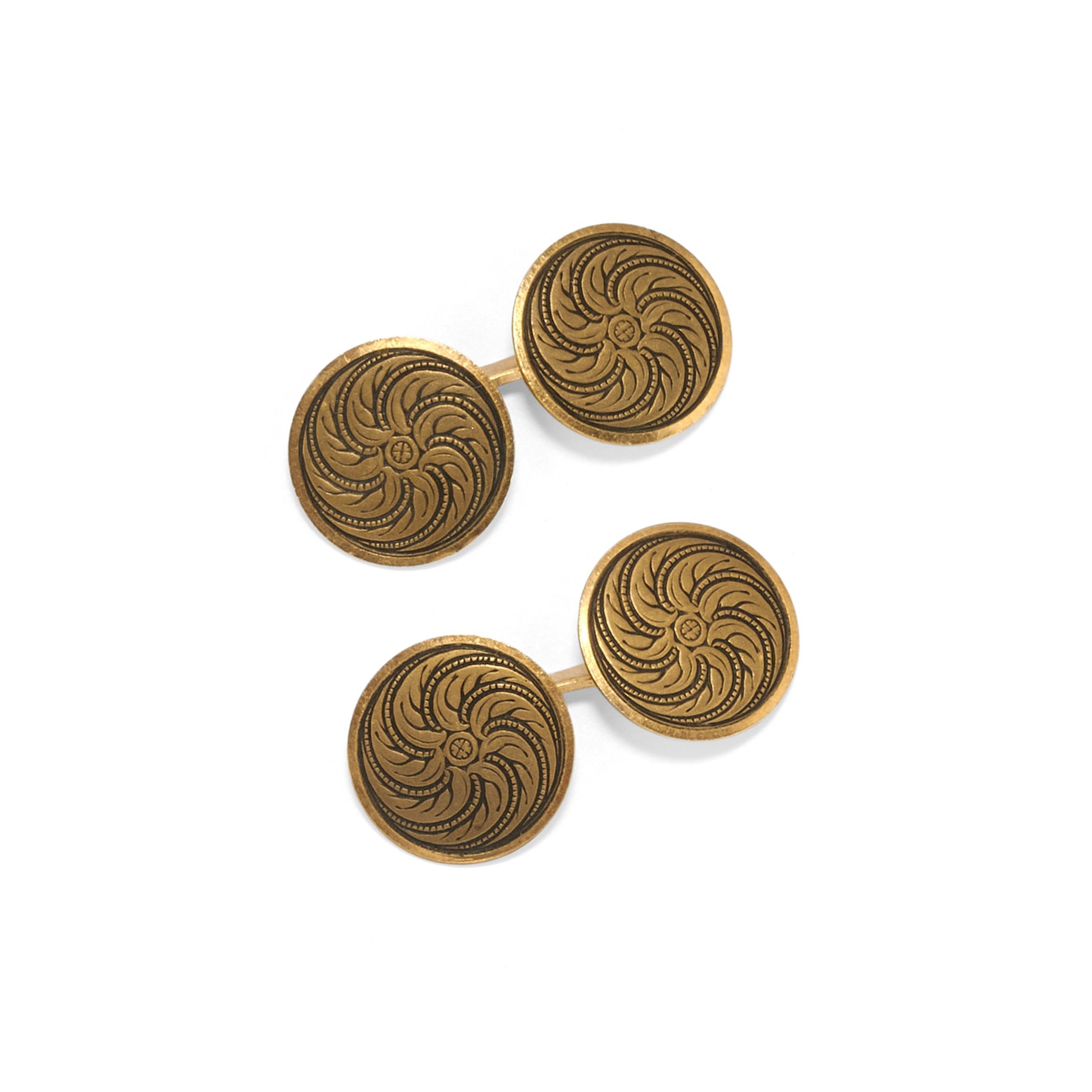 bracciale con maglia a catena alternata a settore rigido, orecchini di forma rotonda con smeraldo taglio rotondo cabochon, chiusura perno e farfalla, coppia di polsini con decoro in smalto nero.