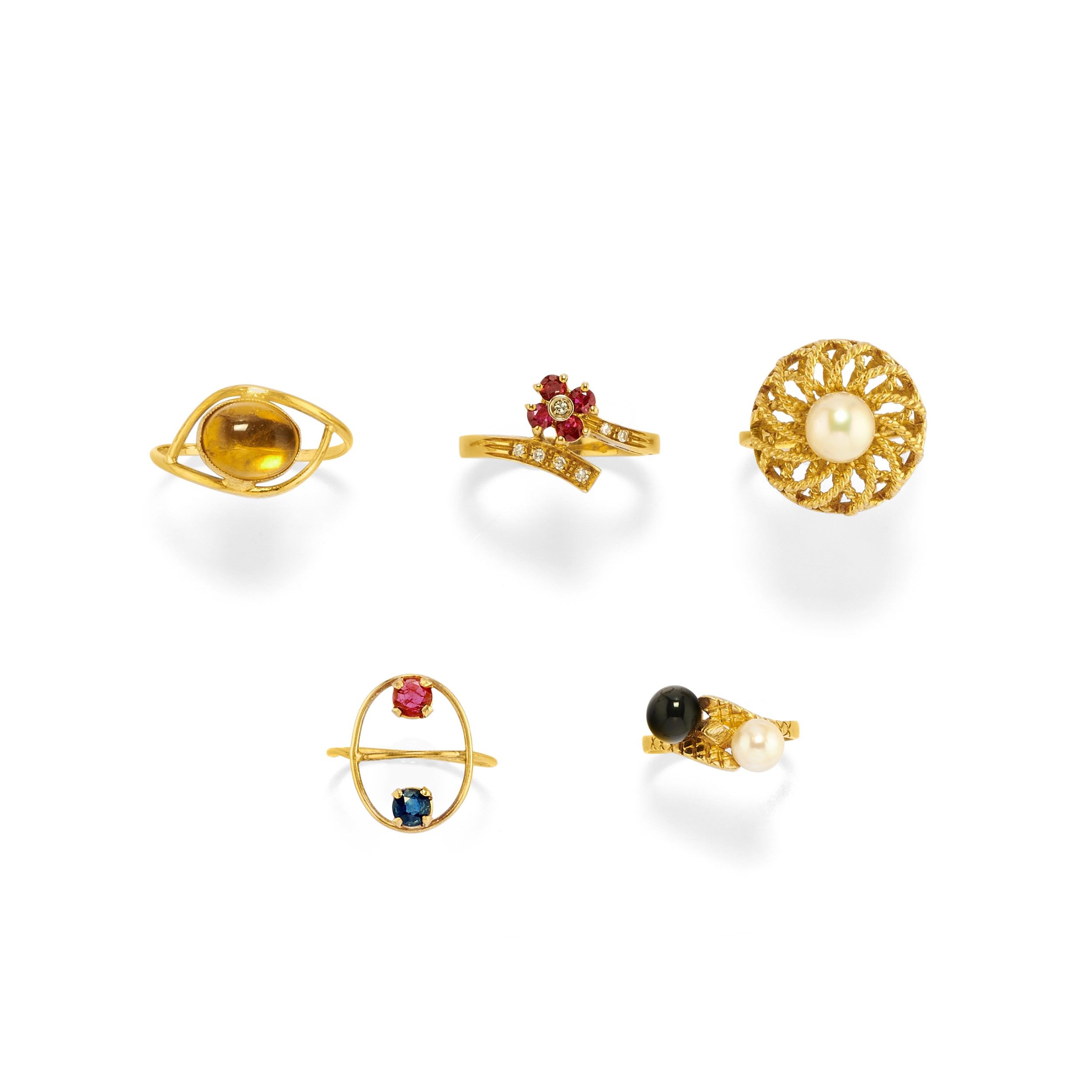 di varie forme e raffigurazioni, zaffiri, rubini, diamanti, perle coltivate, onice e ambra.