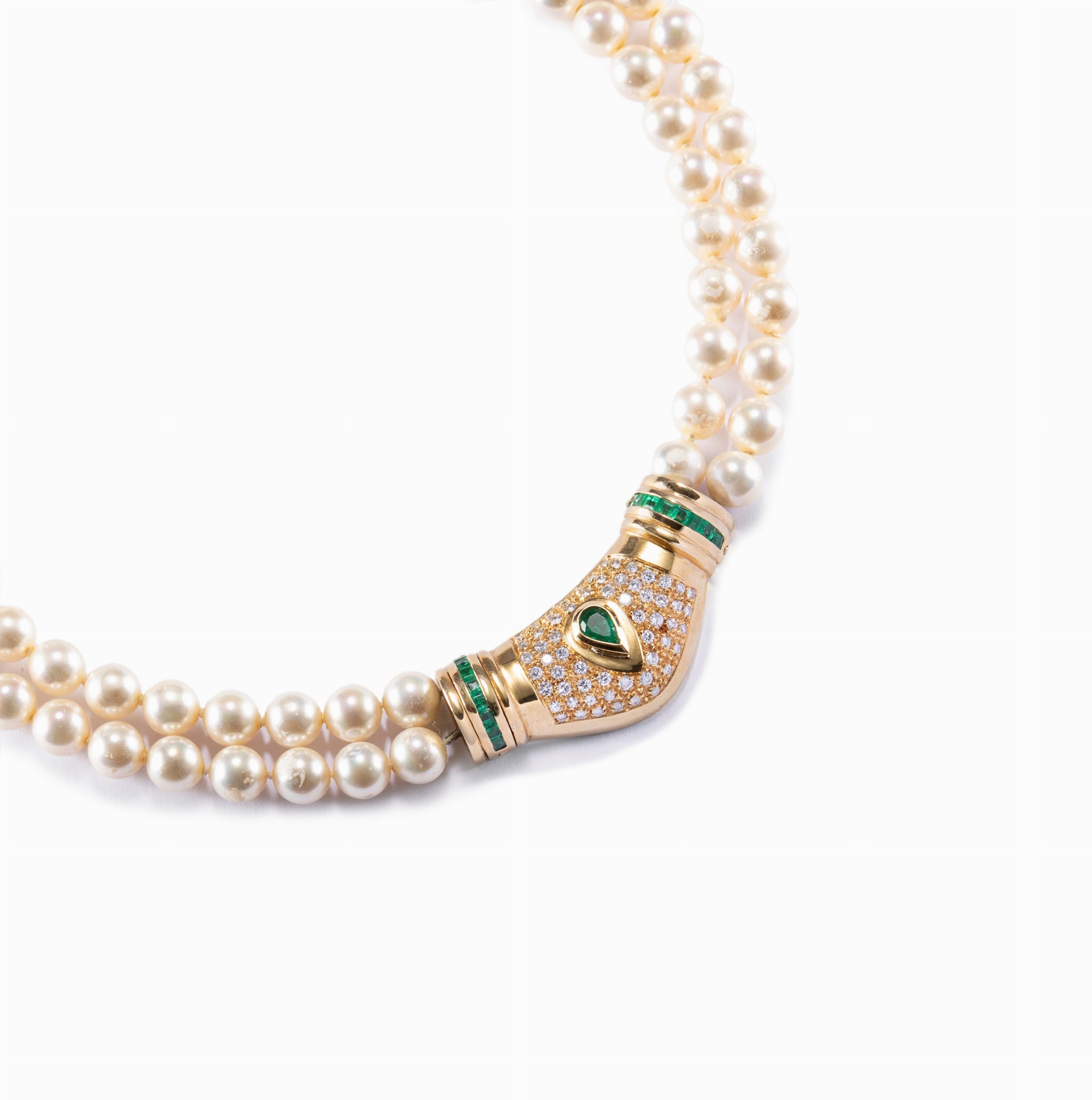 a due fili con centrale impreziosito da smeraldi taglio goccia e carré per totale ct 2,50 circa e diamanti taglio brillante per totale ct 1,80.