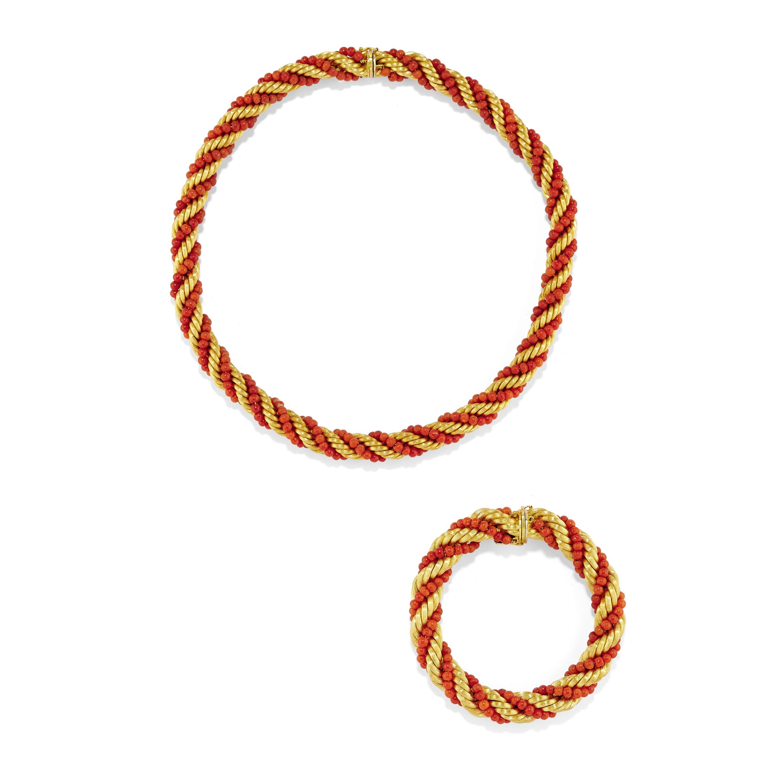 composta da collana e bracciale a torchon in filo d'oro e boules di corallo arancione.