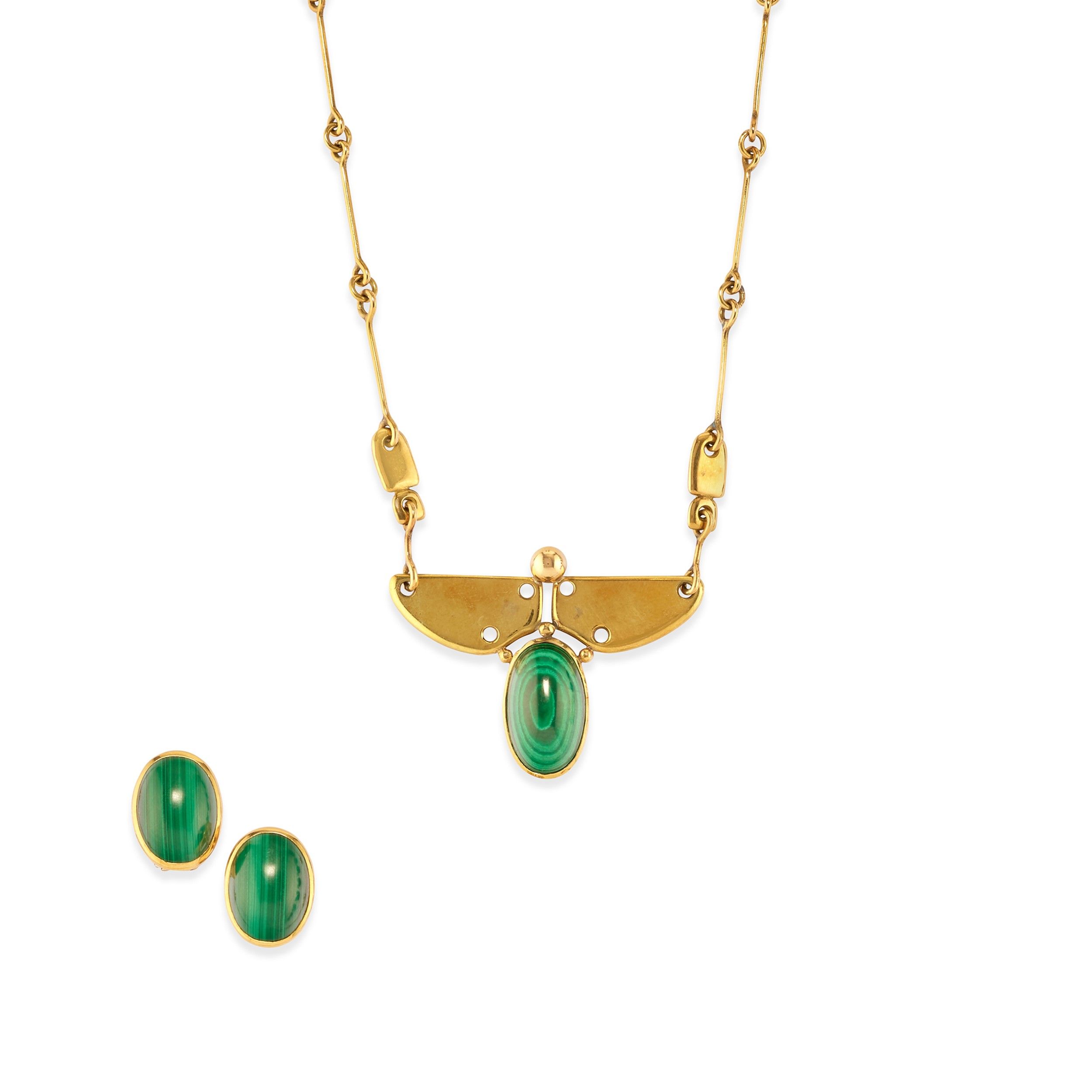 composta da collana e coppia di orecchini con chiusura perno e clip, malachite taglio ovale cabochon.