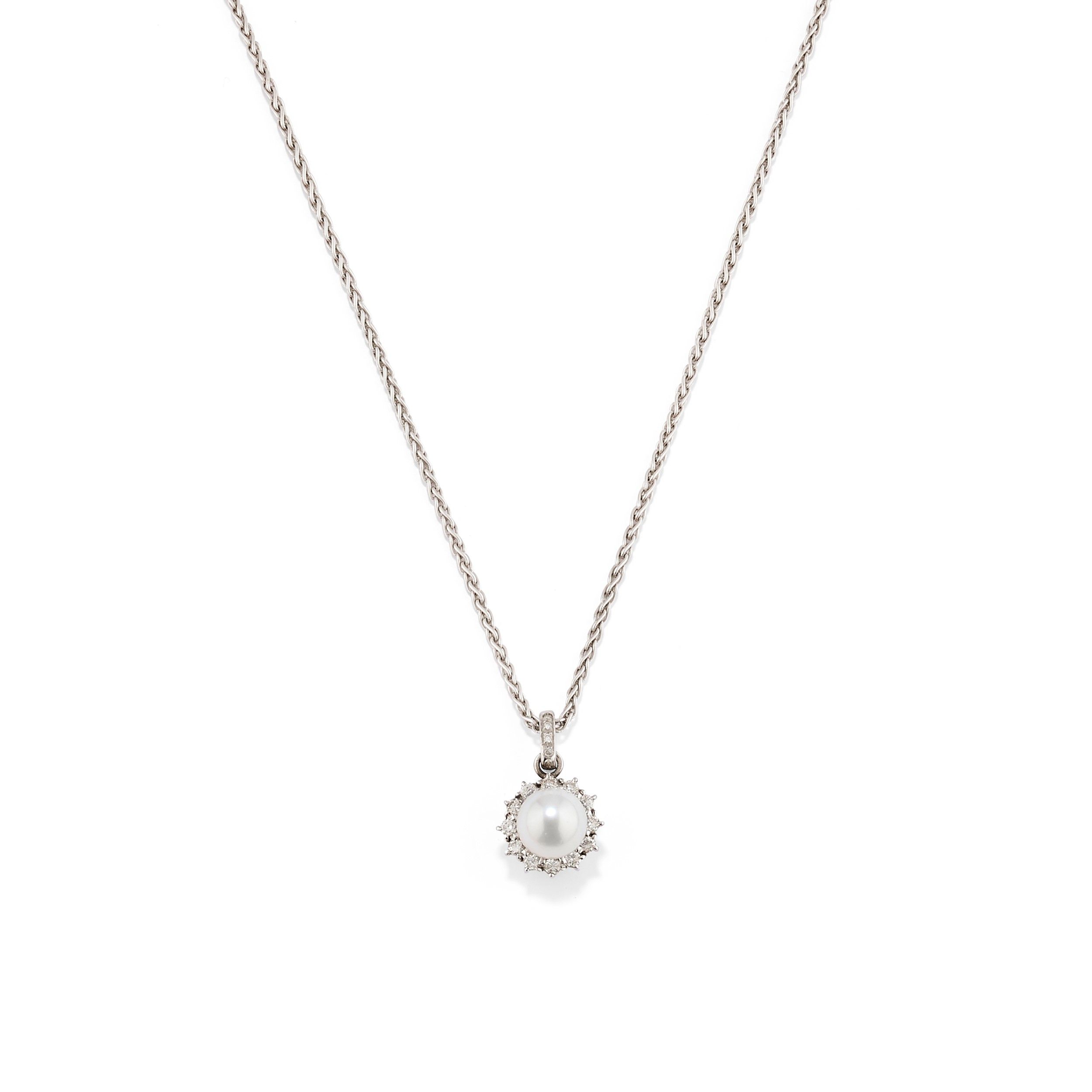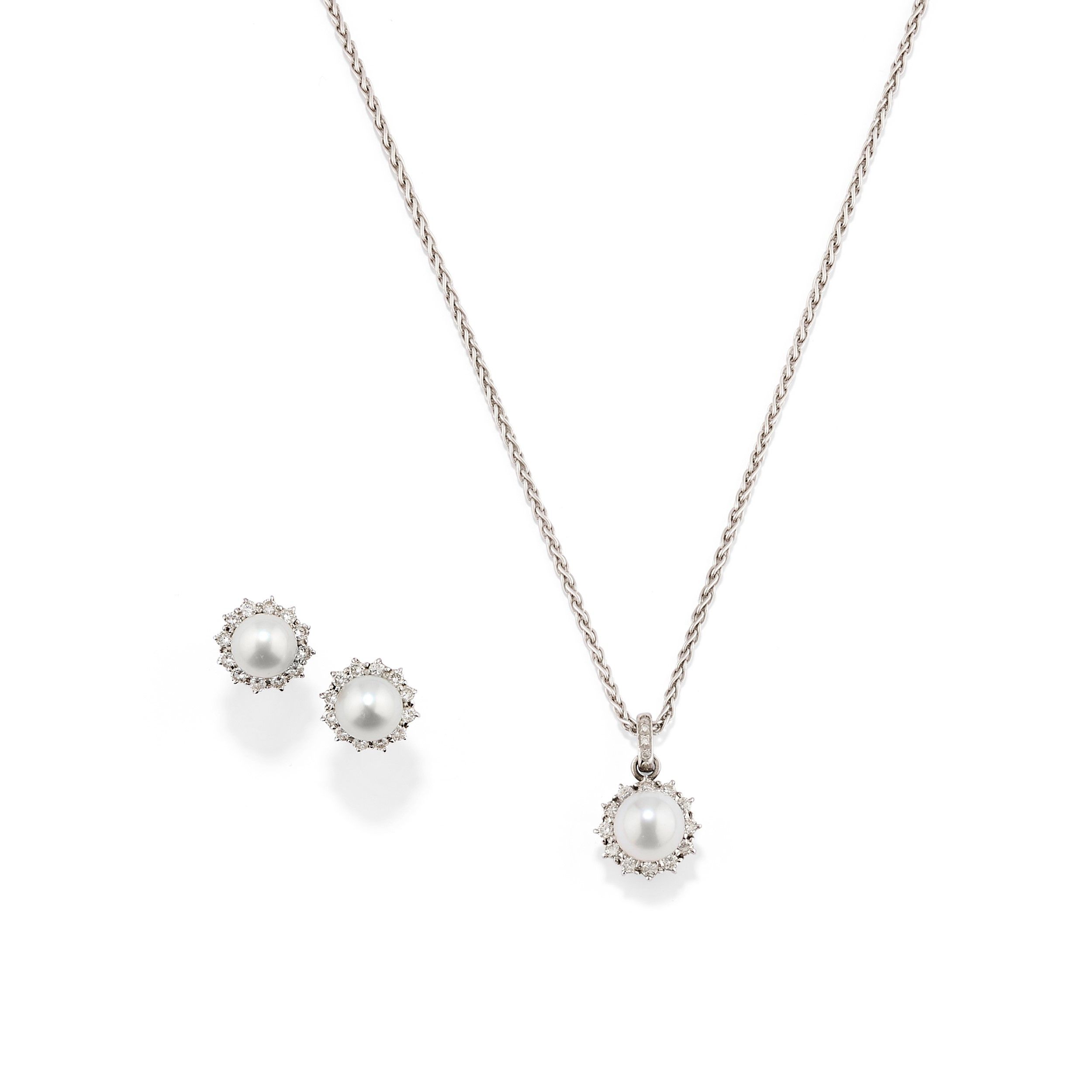 composta da collana e coppia di orecchini con chiusura perno e farfalla, al centro perle coltivate di mm 8,00 circa e contorno in diamanti taglio brillante per totale ct 0,70 circa.