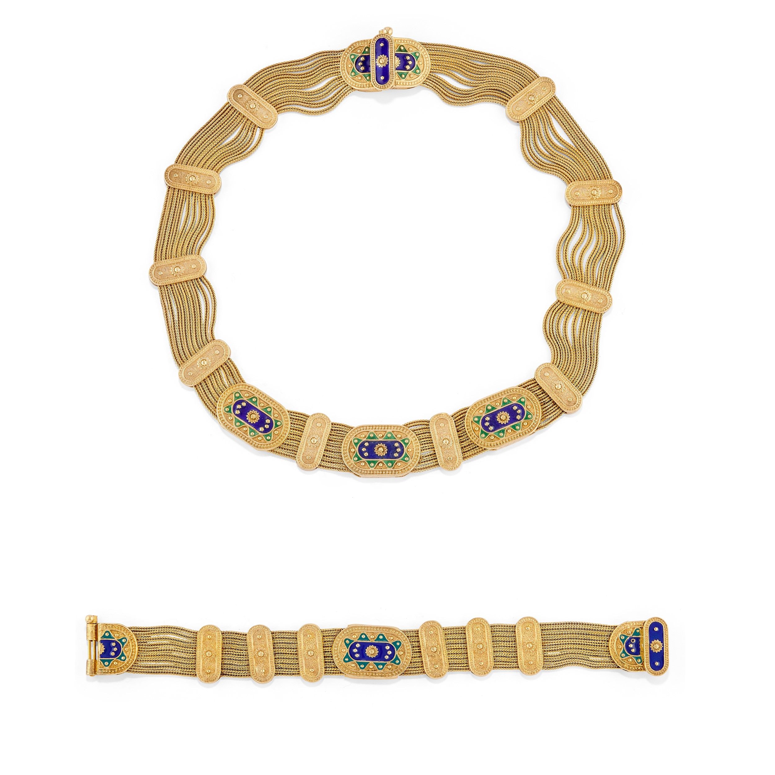 composta da collana e bracciale con decoro in smalto verde e blu.
