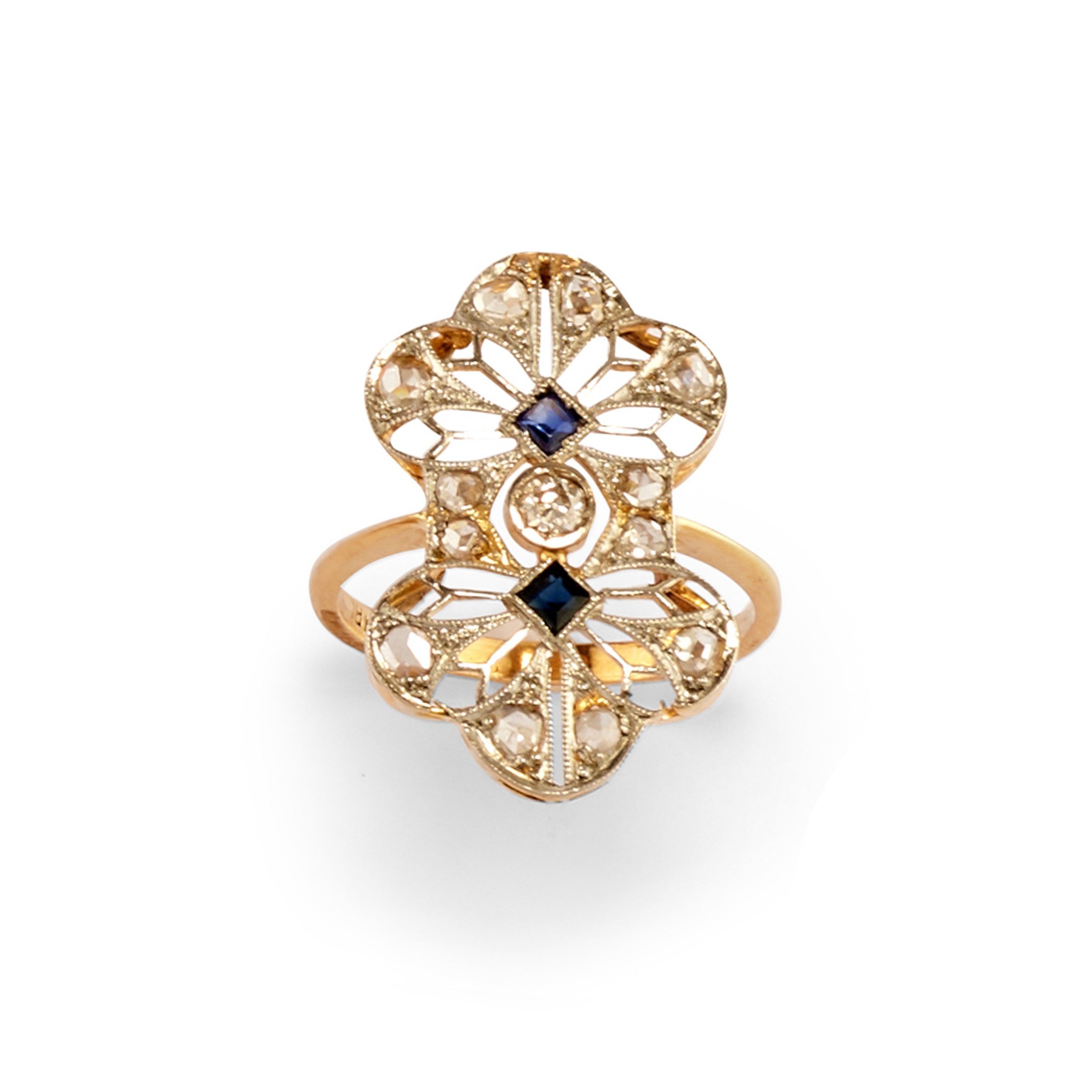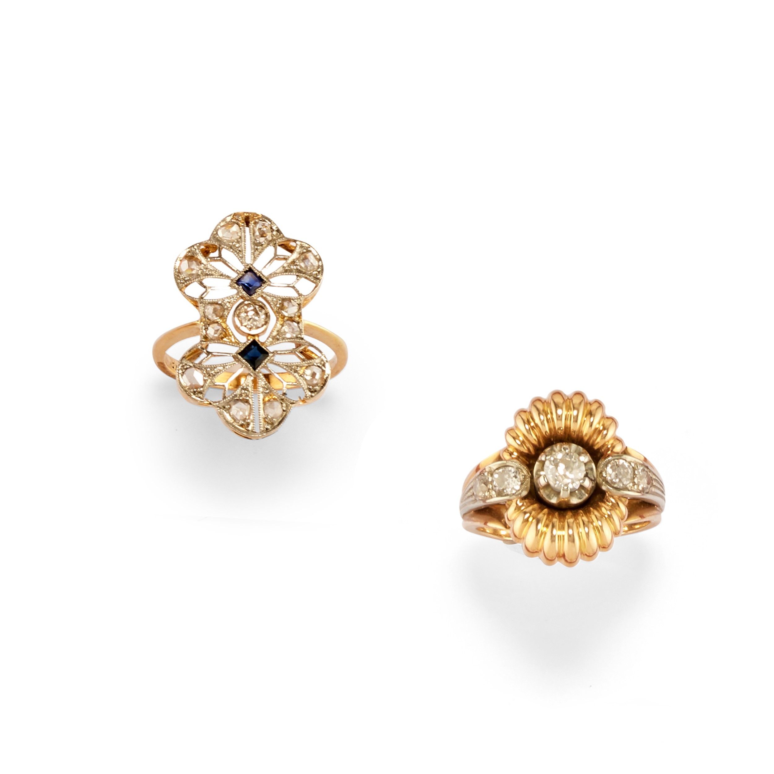 uno con sommità allungata e traforata trattenente diamanti taglio rosa e vecchio, zaffiri taglio carrè; uno anni '40 con sommità a conchiglia e al centro diamanti taglio vecchio.