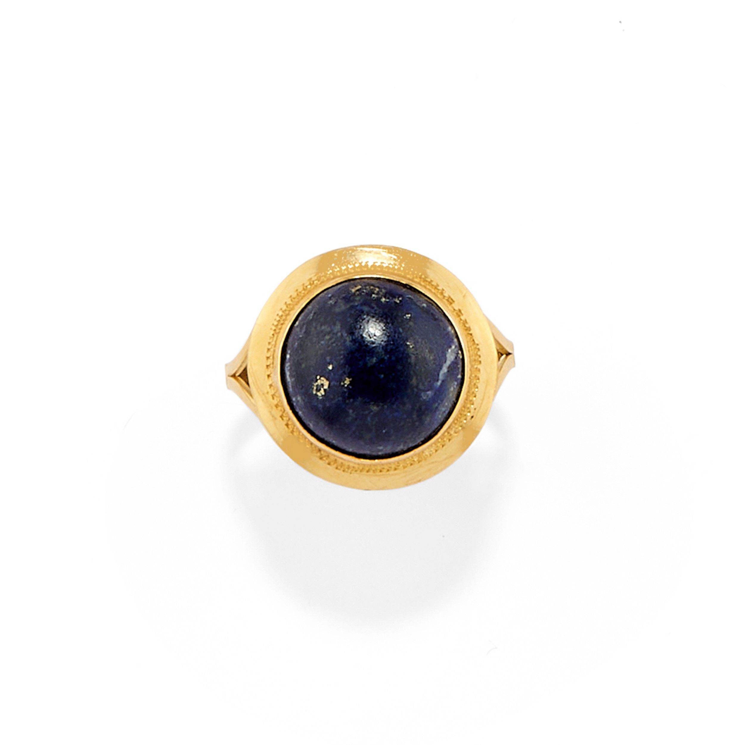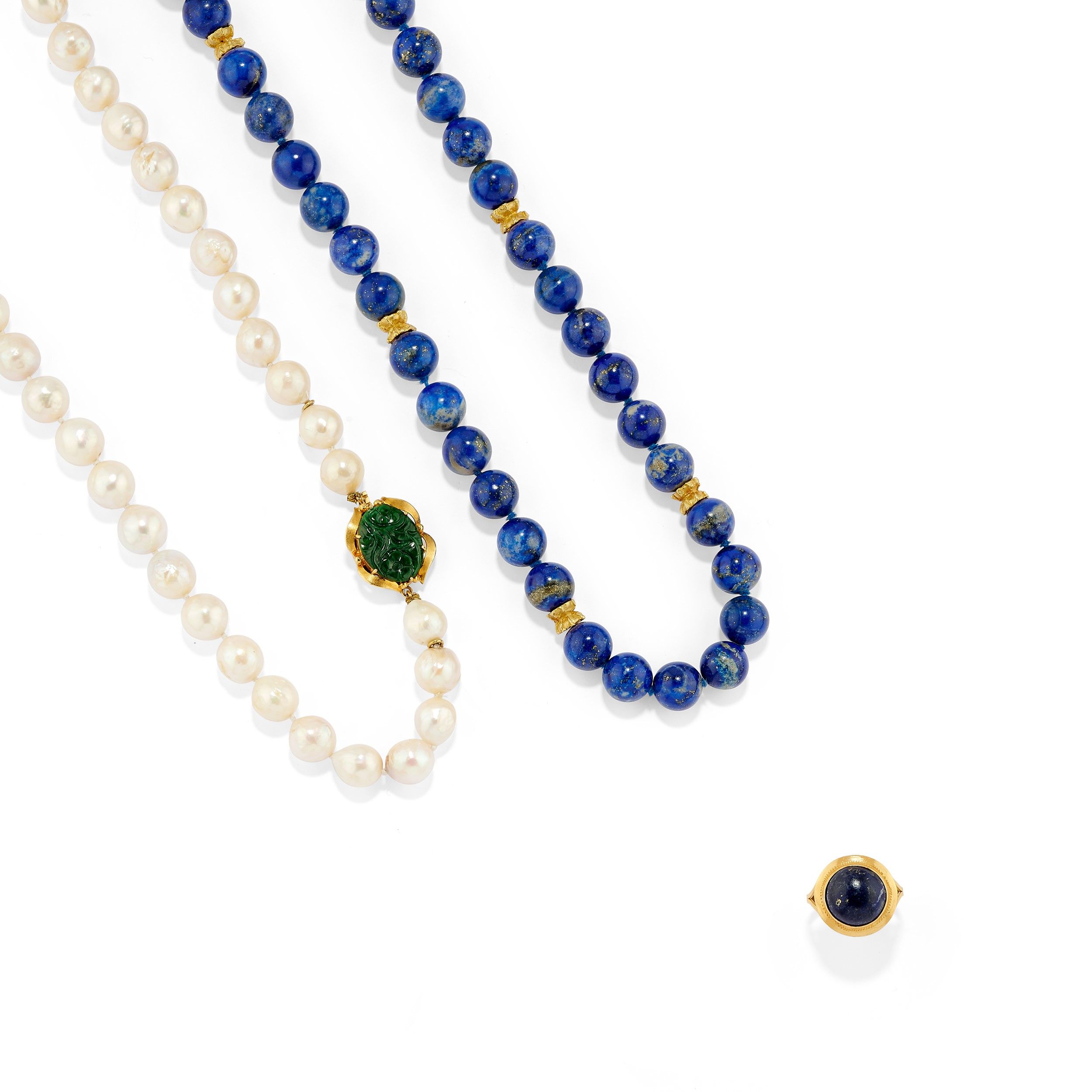 una con boules in lapislazzuli, una con perle coltivate barocche e chiusura con inserto in giadeite, anello con lapislazzuli.