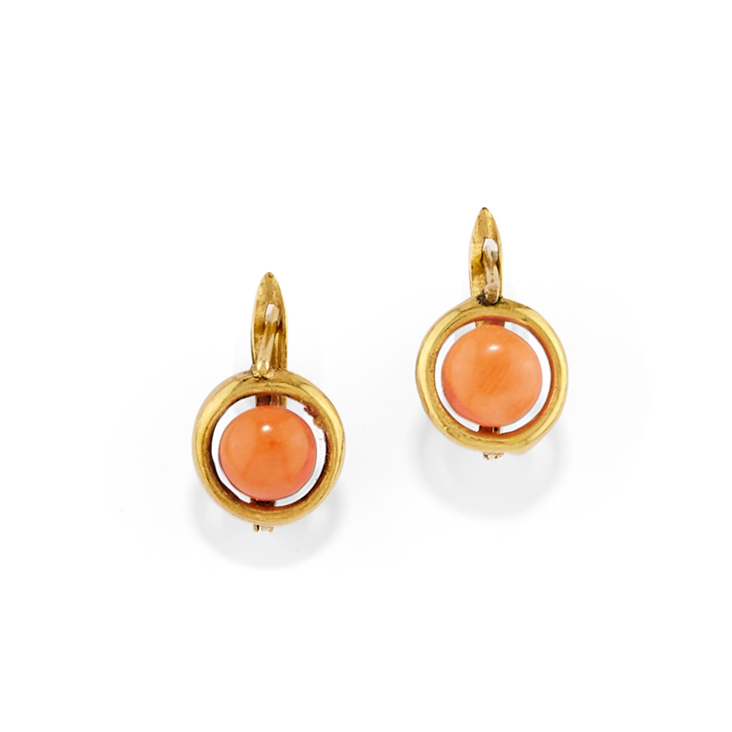 una a bottone con corallo rosa di mm 11,00 circa e una con corallo rosso cabochon di mm 7,00 circa, chiusure perno e clip.