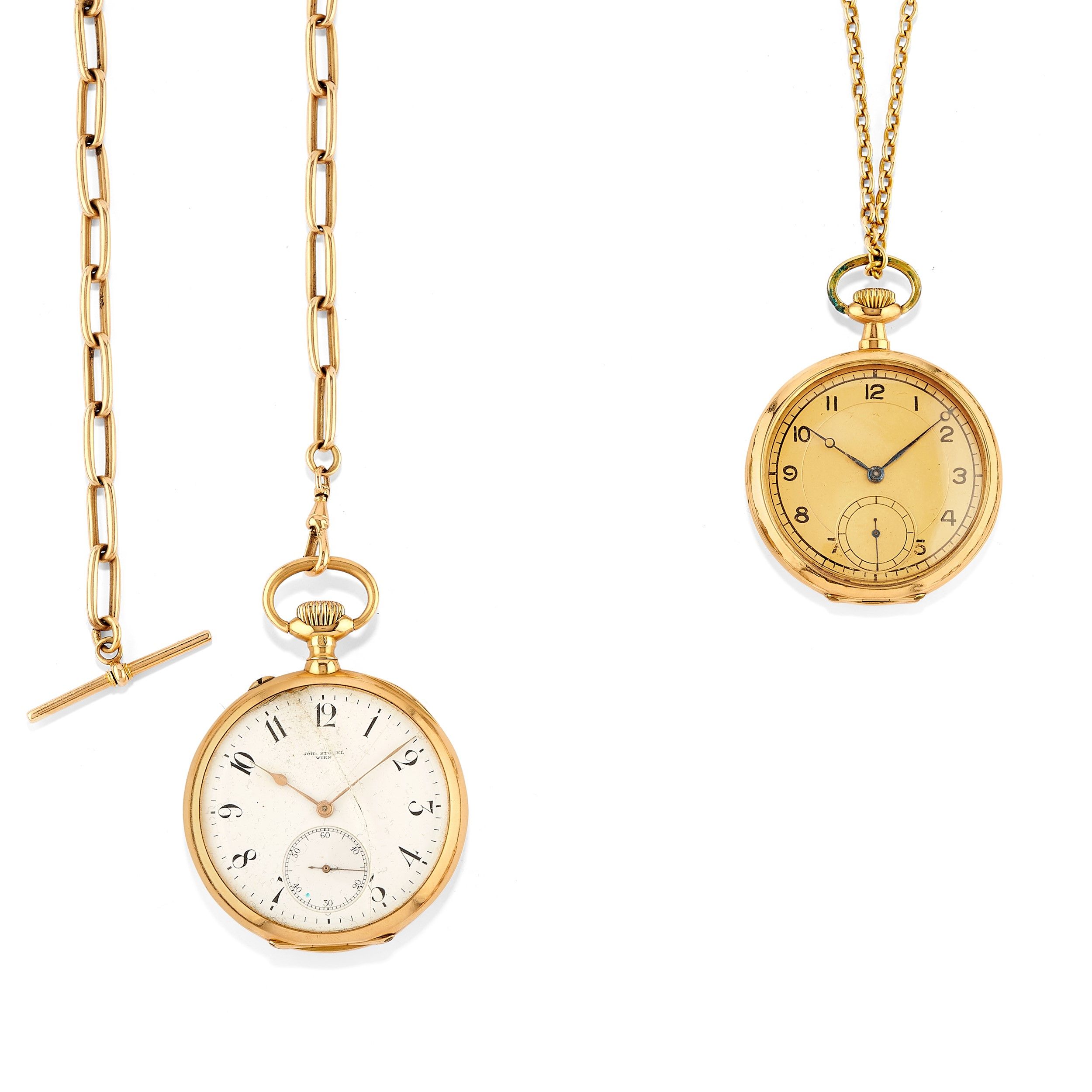 uno con cassa rotonda, quadrante champagne con numeri arabi in smalto nero, secondi al 6, l'altro con cassa rotonda, quadrante bianco con numeri arabi in smalto nero, secondi al 6, difetti (rotture, mancanze, ammaccature, non funzionanti).