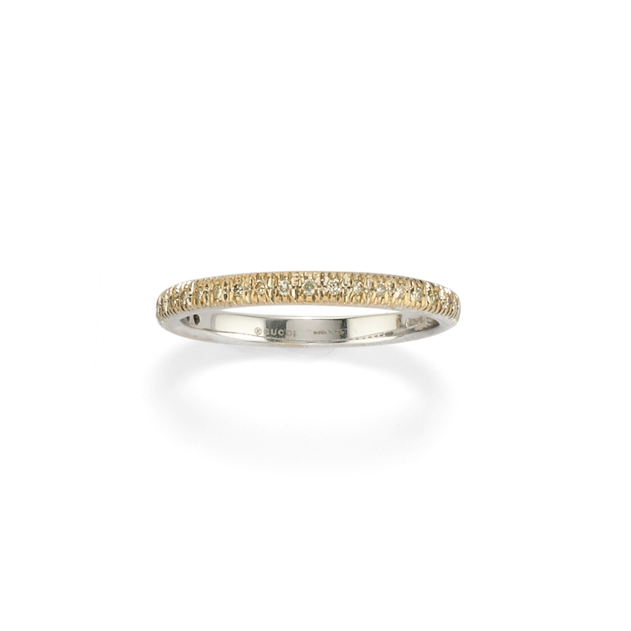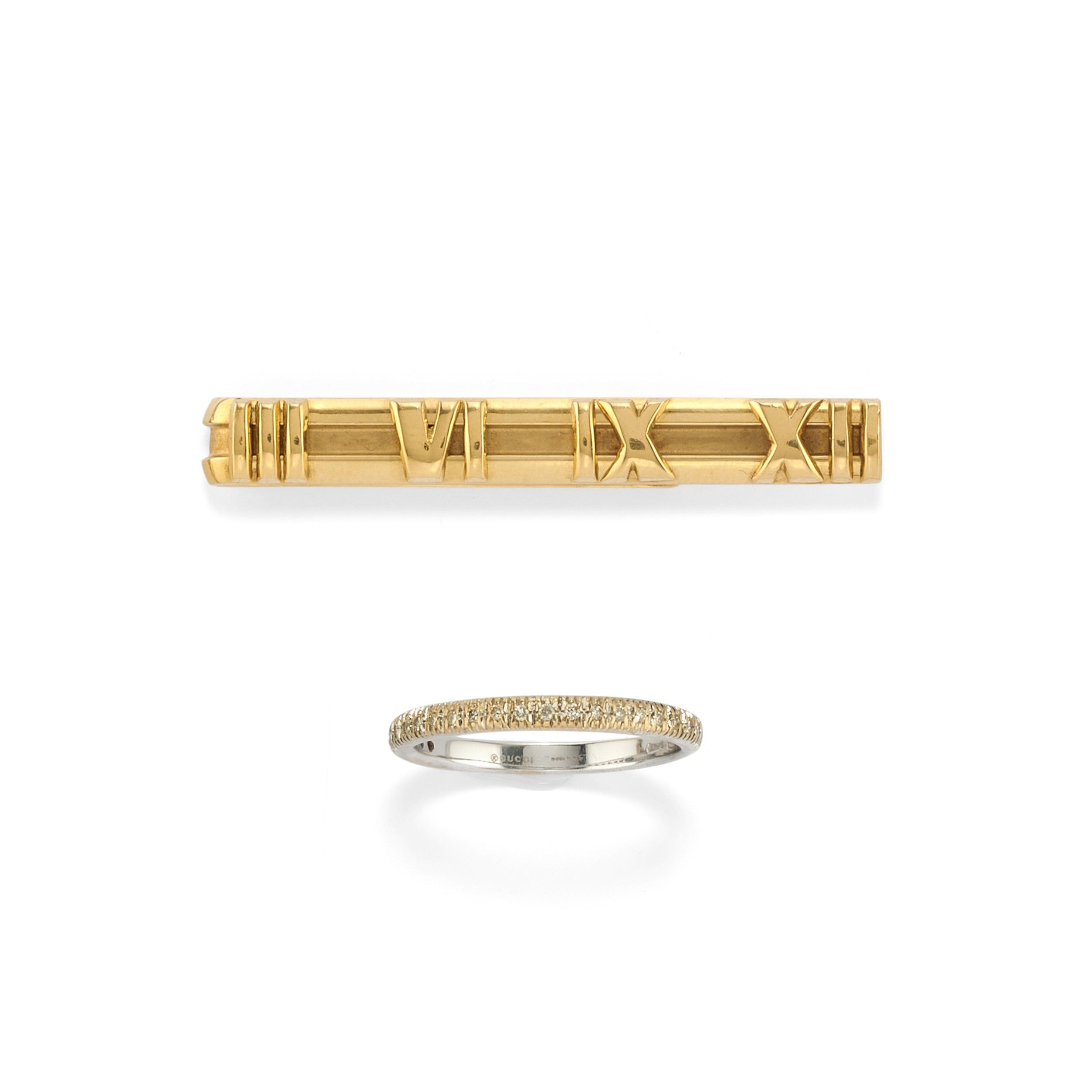 fermacravatta di Tiffany e anello di Gucci con piccoli diamanti taglio brillante.