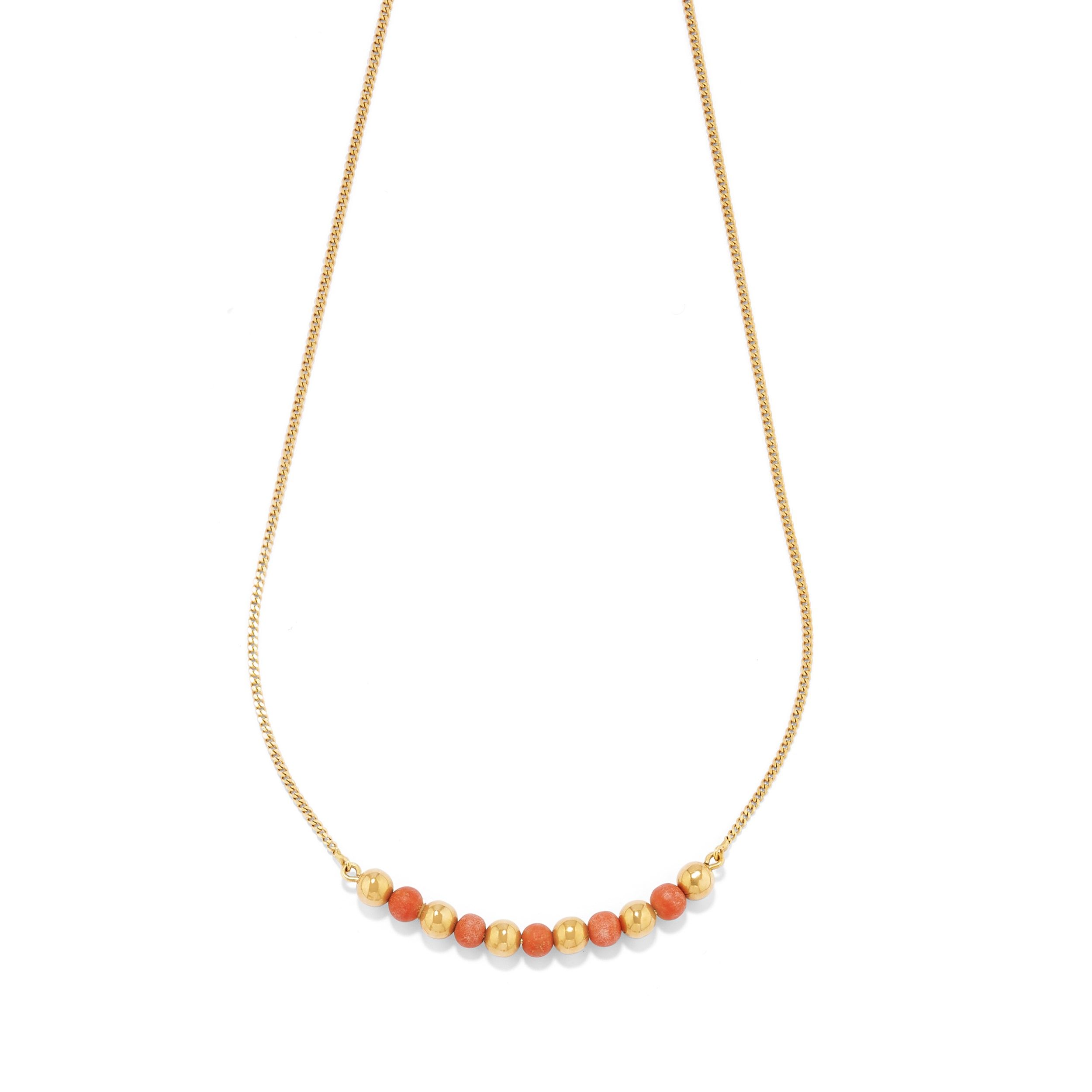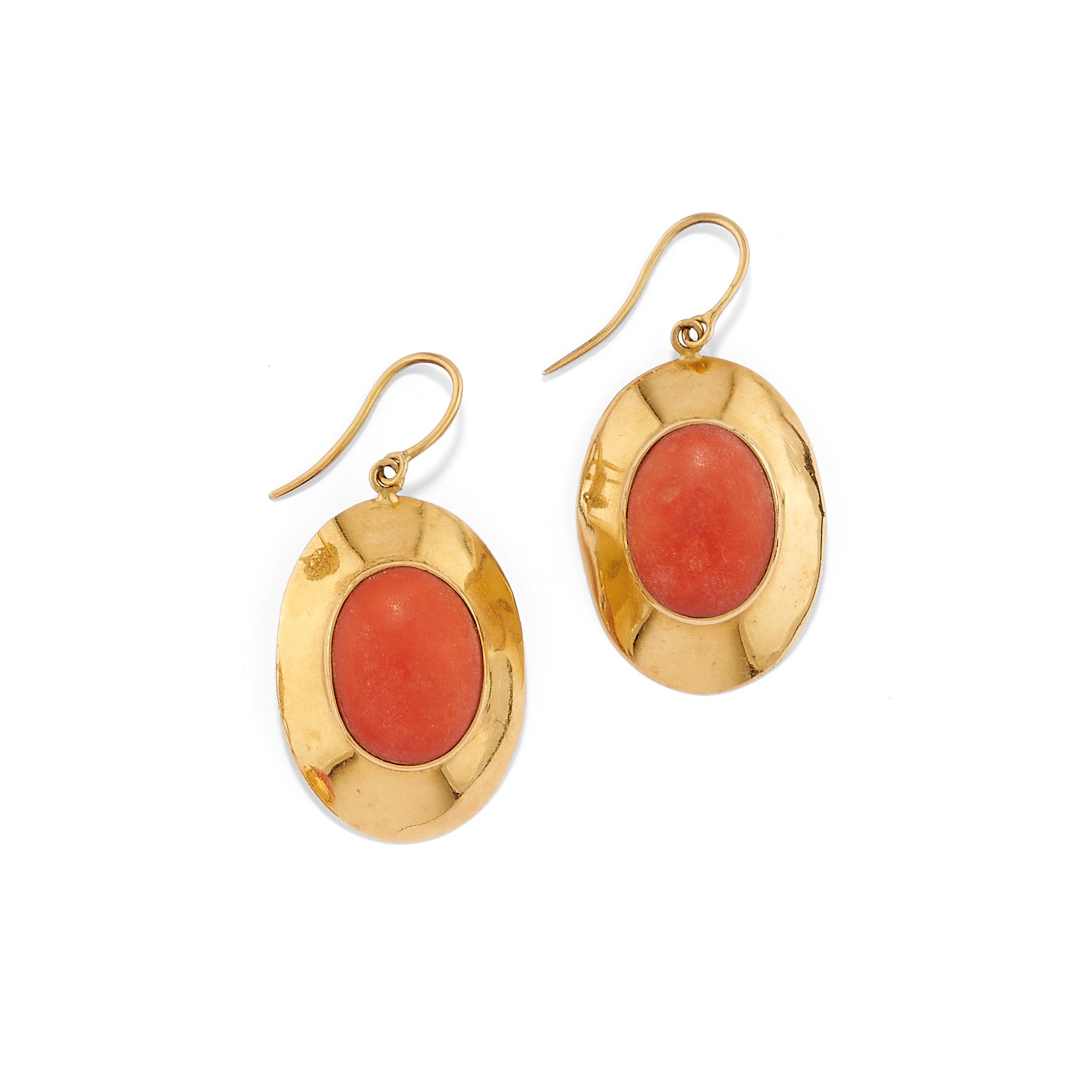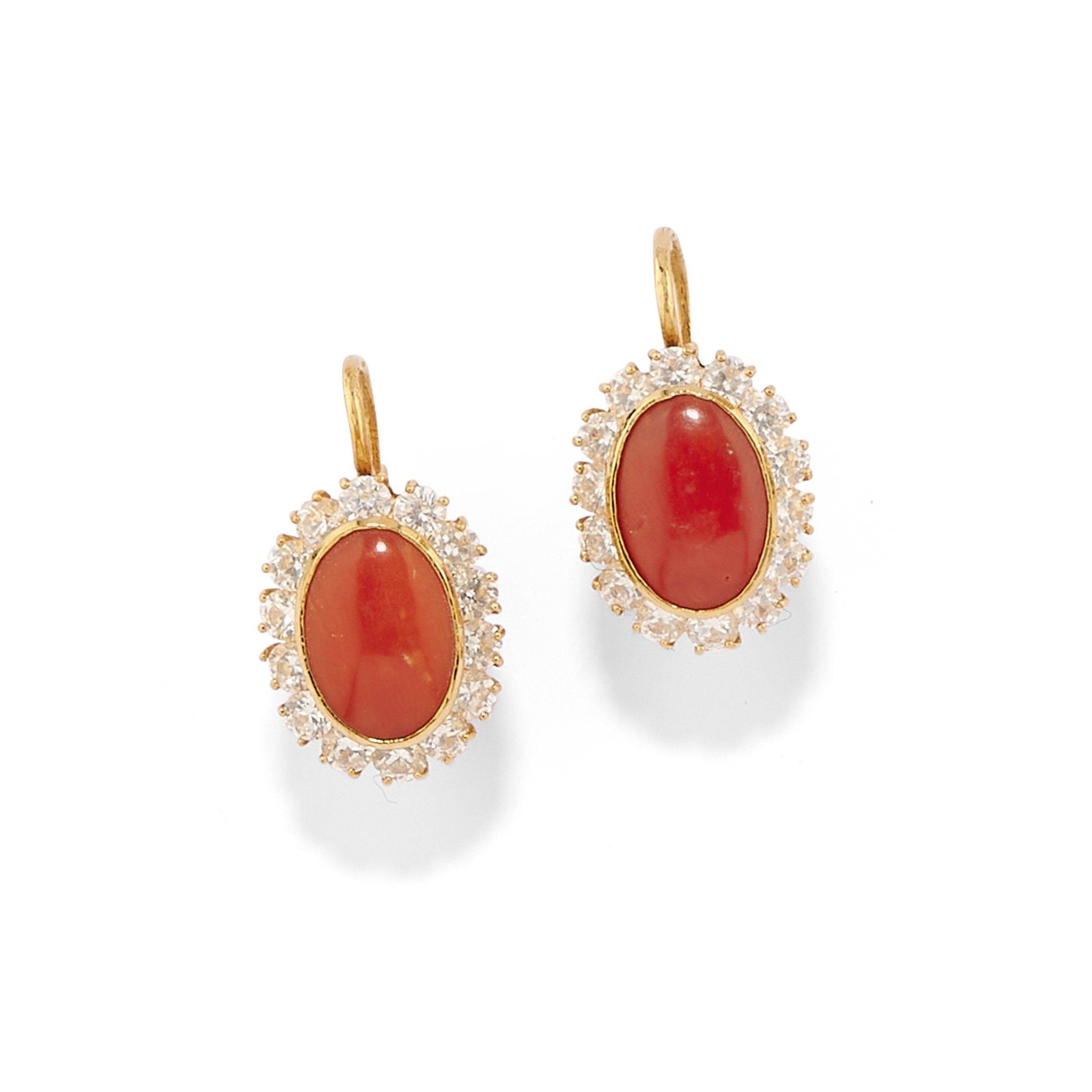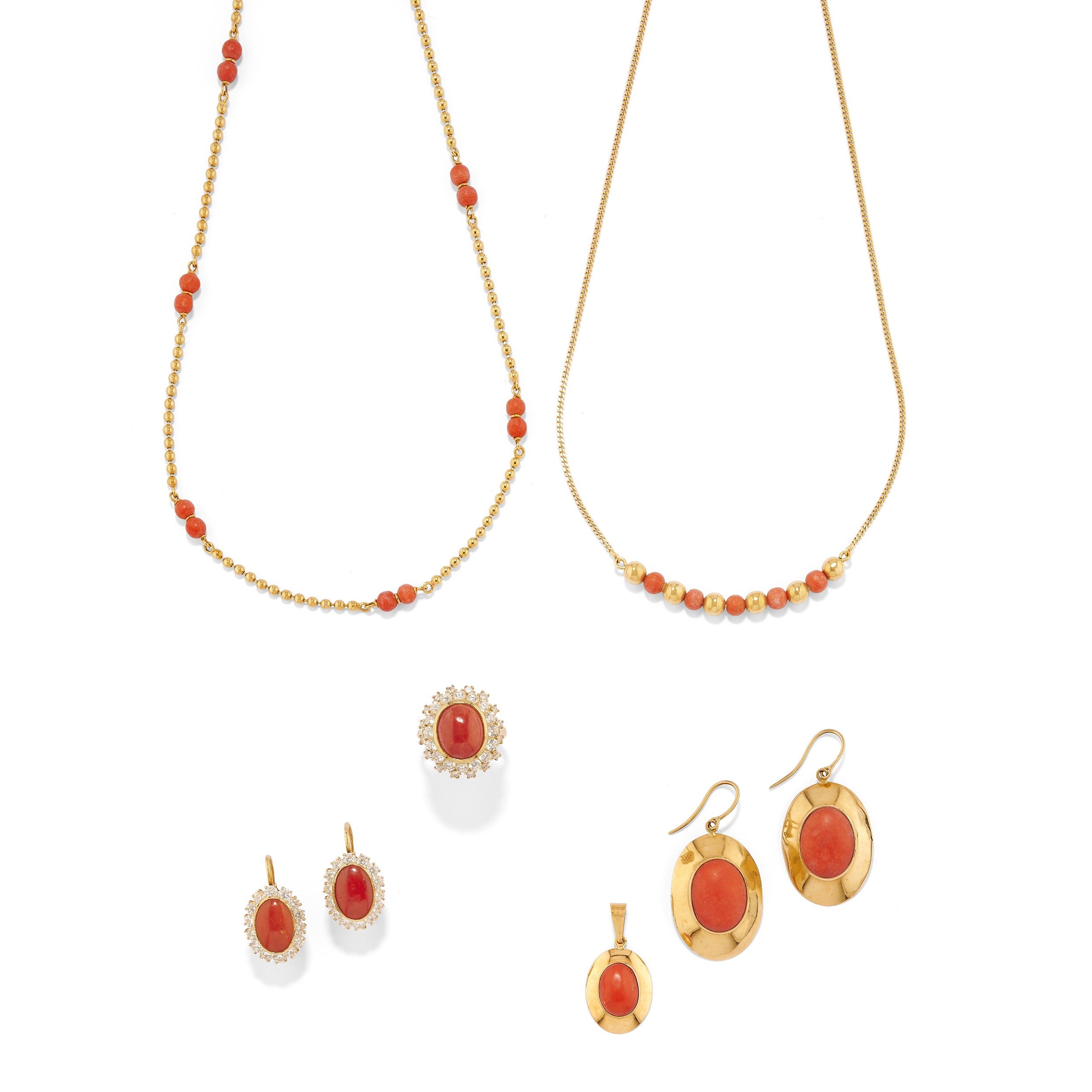 impreziositi da corallo e pietre incolori sintetiche ad imitazione del diamante, composto da un anello, un pendente, due collane e due coppie di orecchini con chiusure a monachella e monachella e clip.