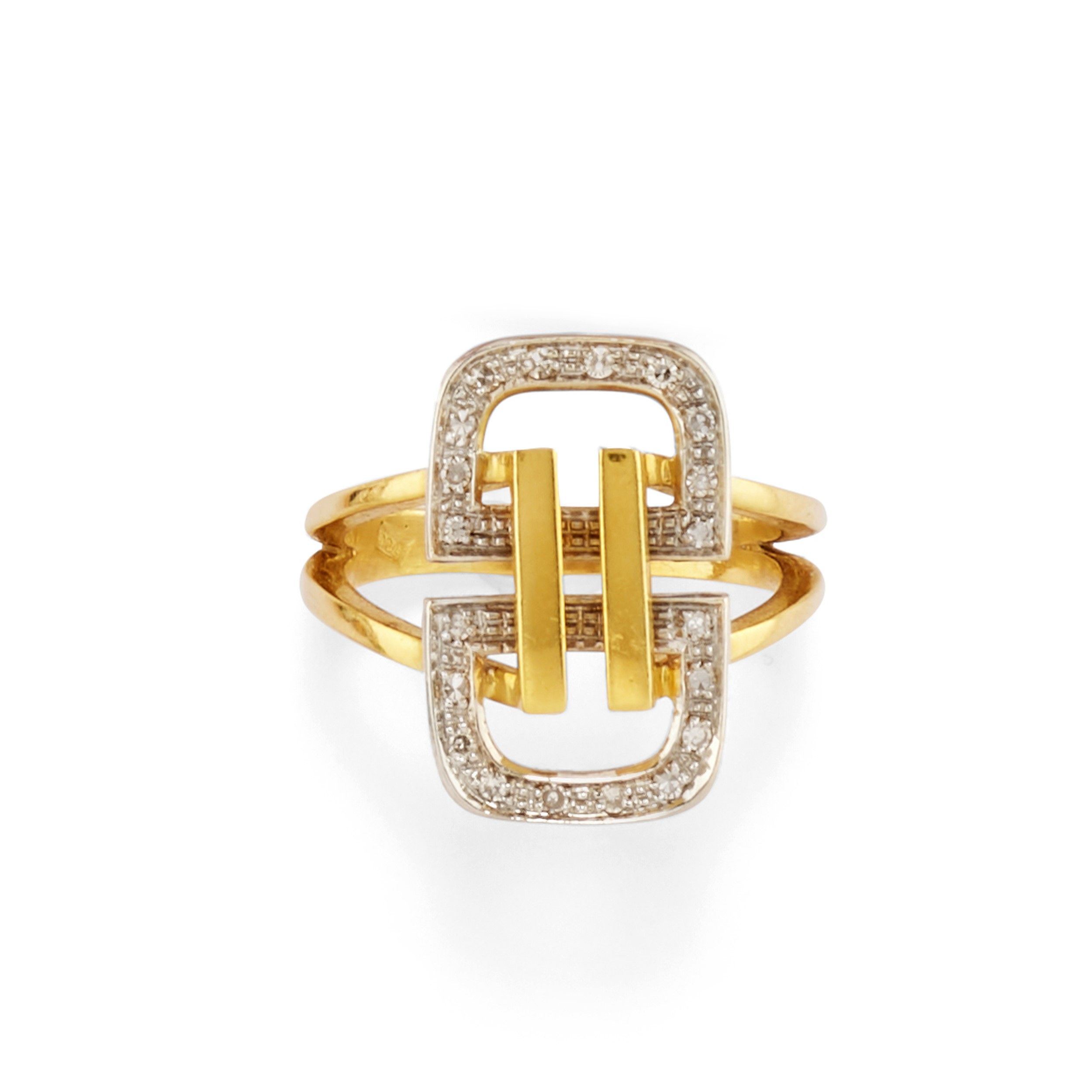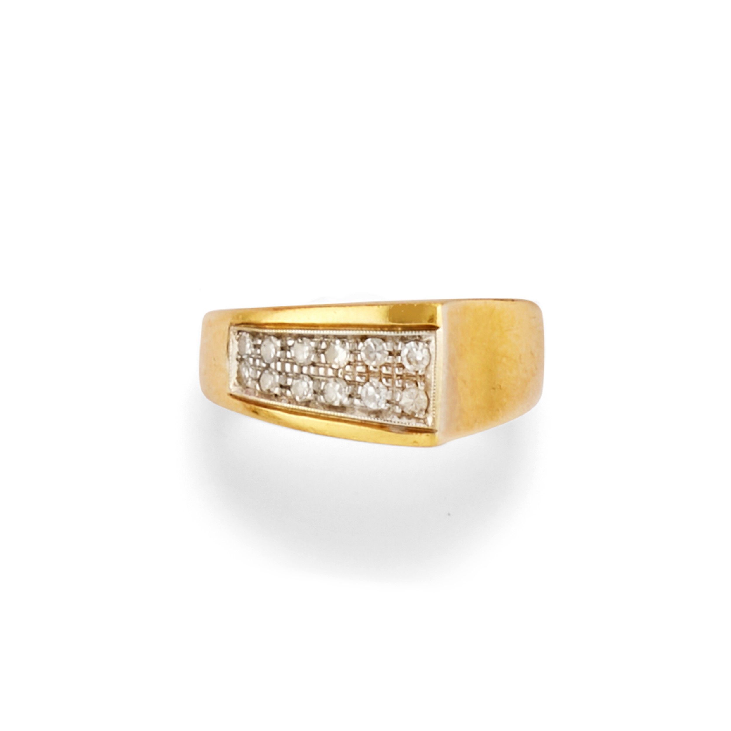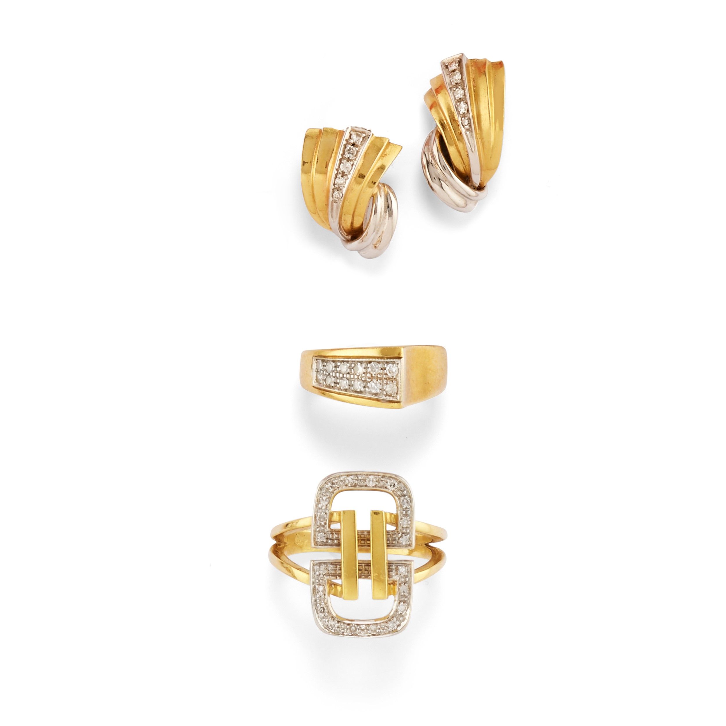 composto da due anelli e una coppia di orecchini con chiusura perno e clip, decorati da diamanti taglio huit-huit.