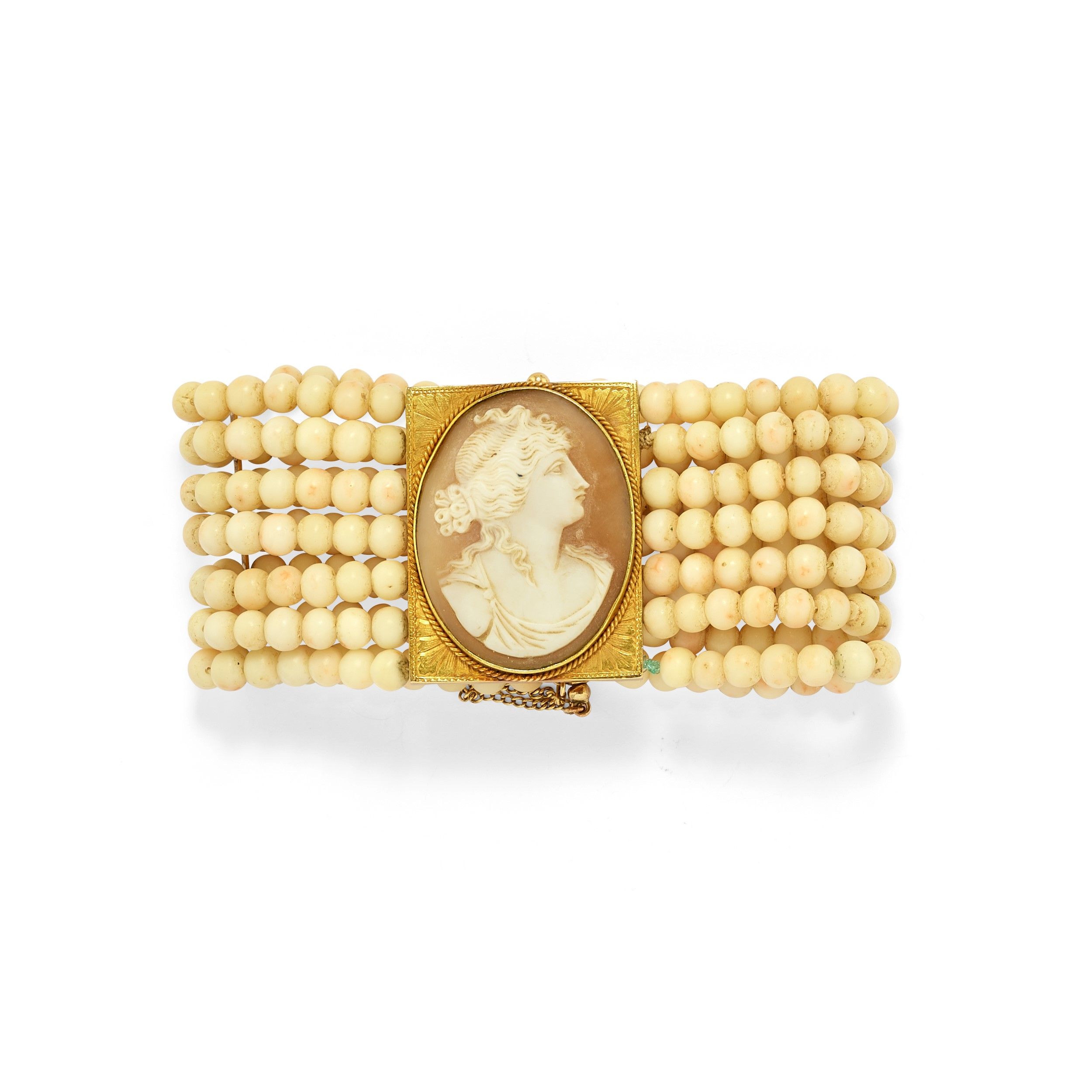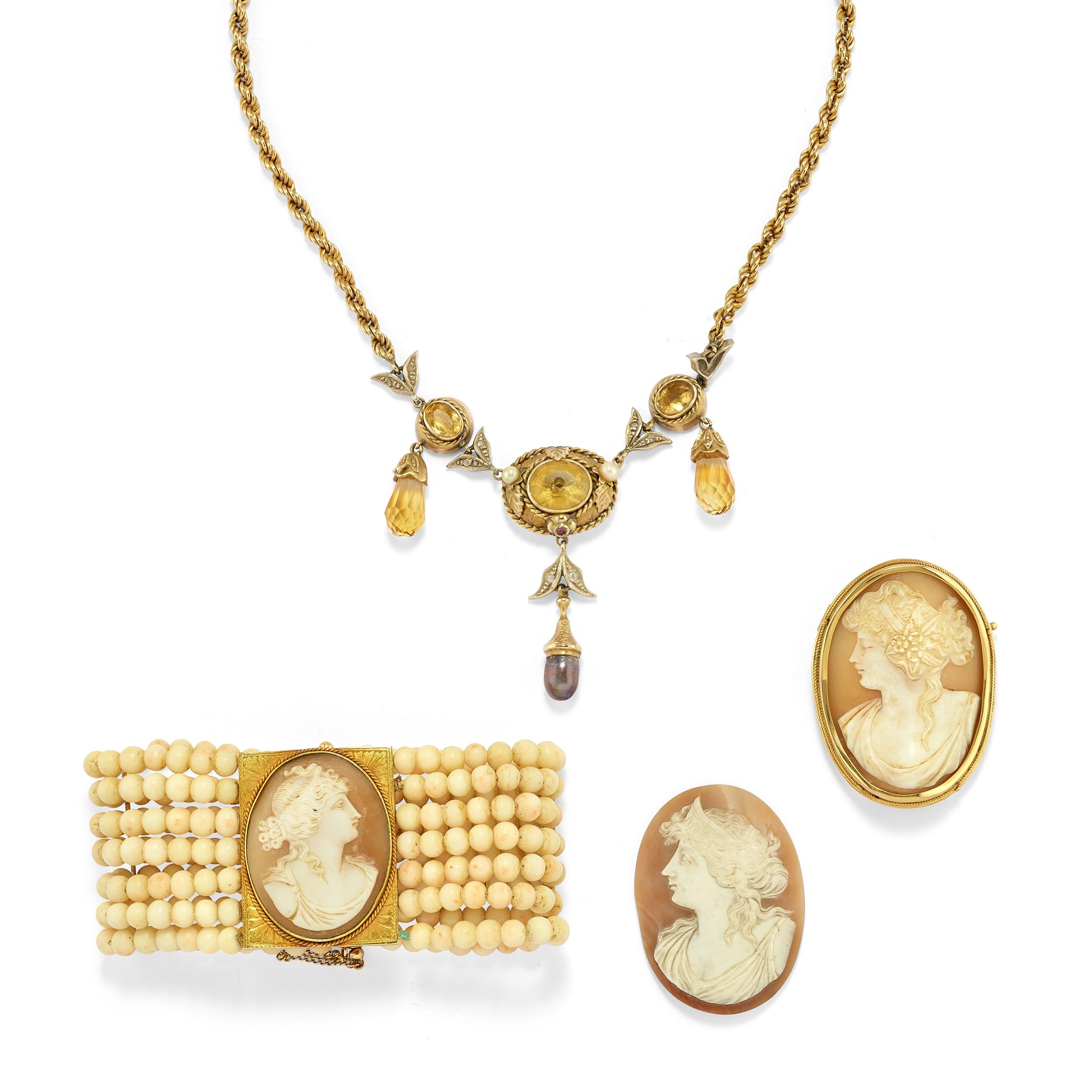 composto da bracciale, spilla, cammeo senza montatura e collana, difetti (visibili mancanze).