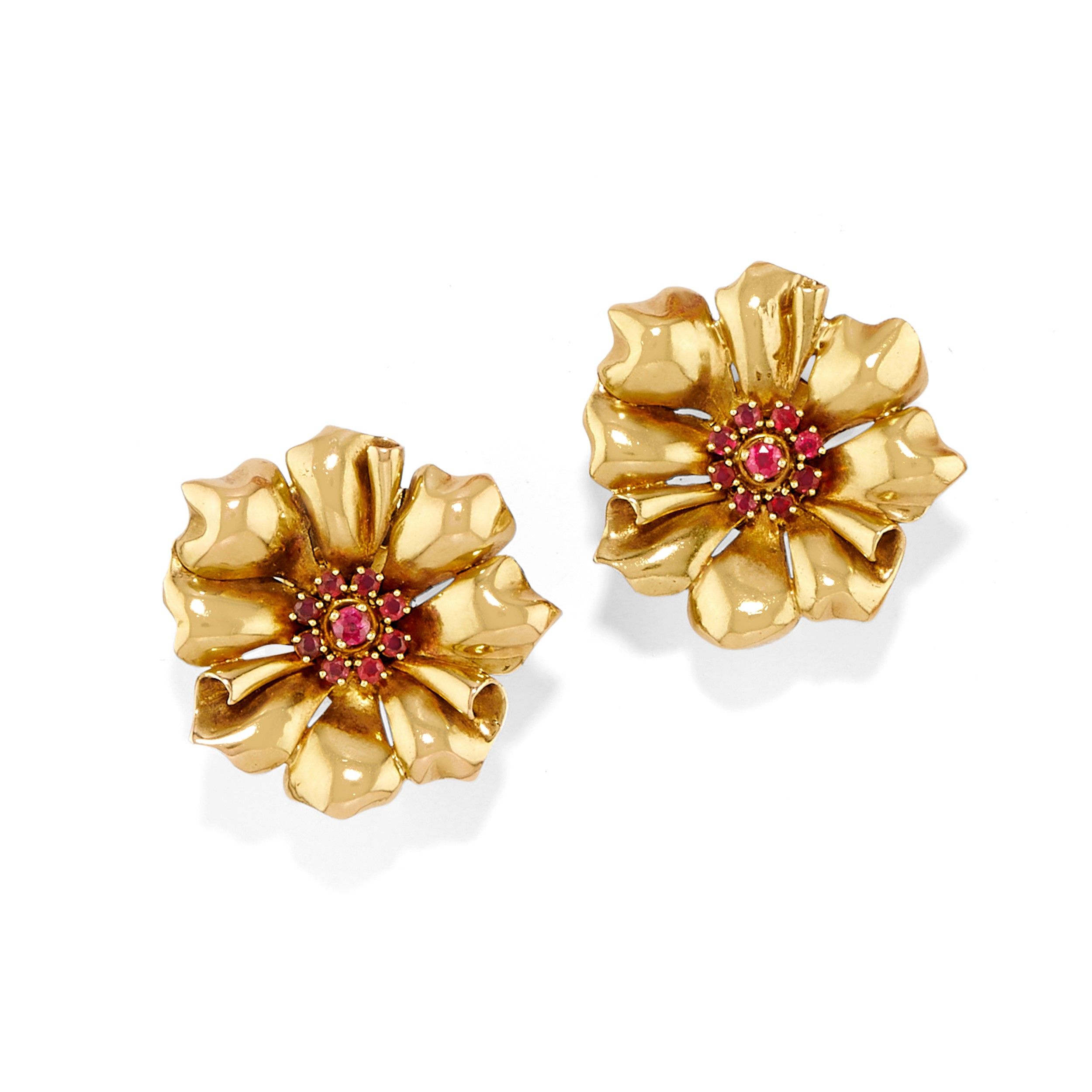 a fiore con al centro rubini taglio rotondo per totale ct 0,50 circa, chiusura perno e clip.