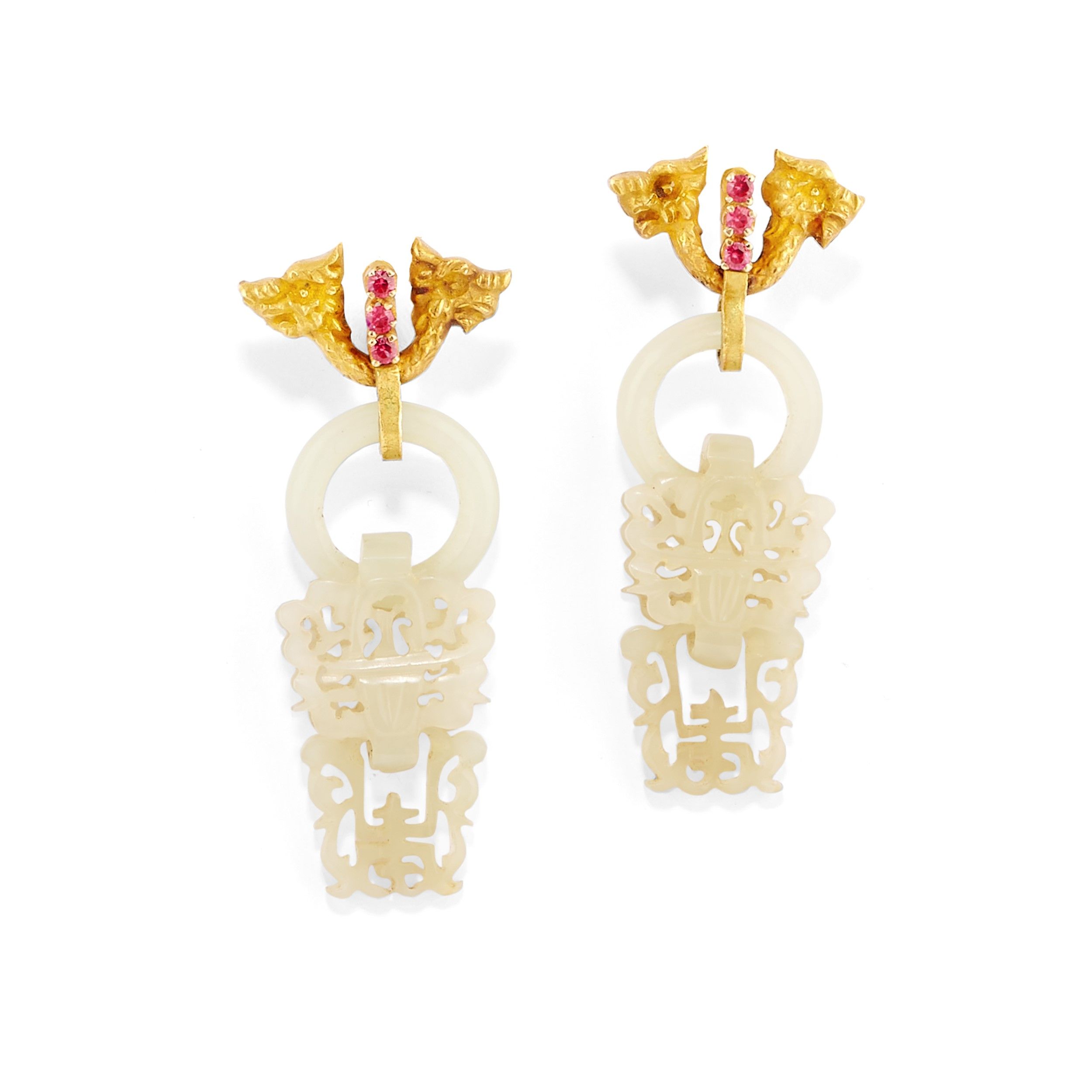 parte superiore con teste zoomorfe e pietre rosse taglio rotondo, parte inferiore in giadeite scolpita e traforata, chiusura perno e vite, difetti (mancanza di materiale a due pietre rosse).