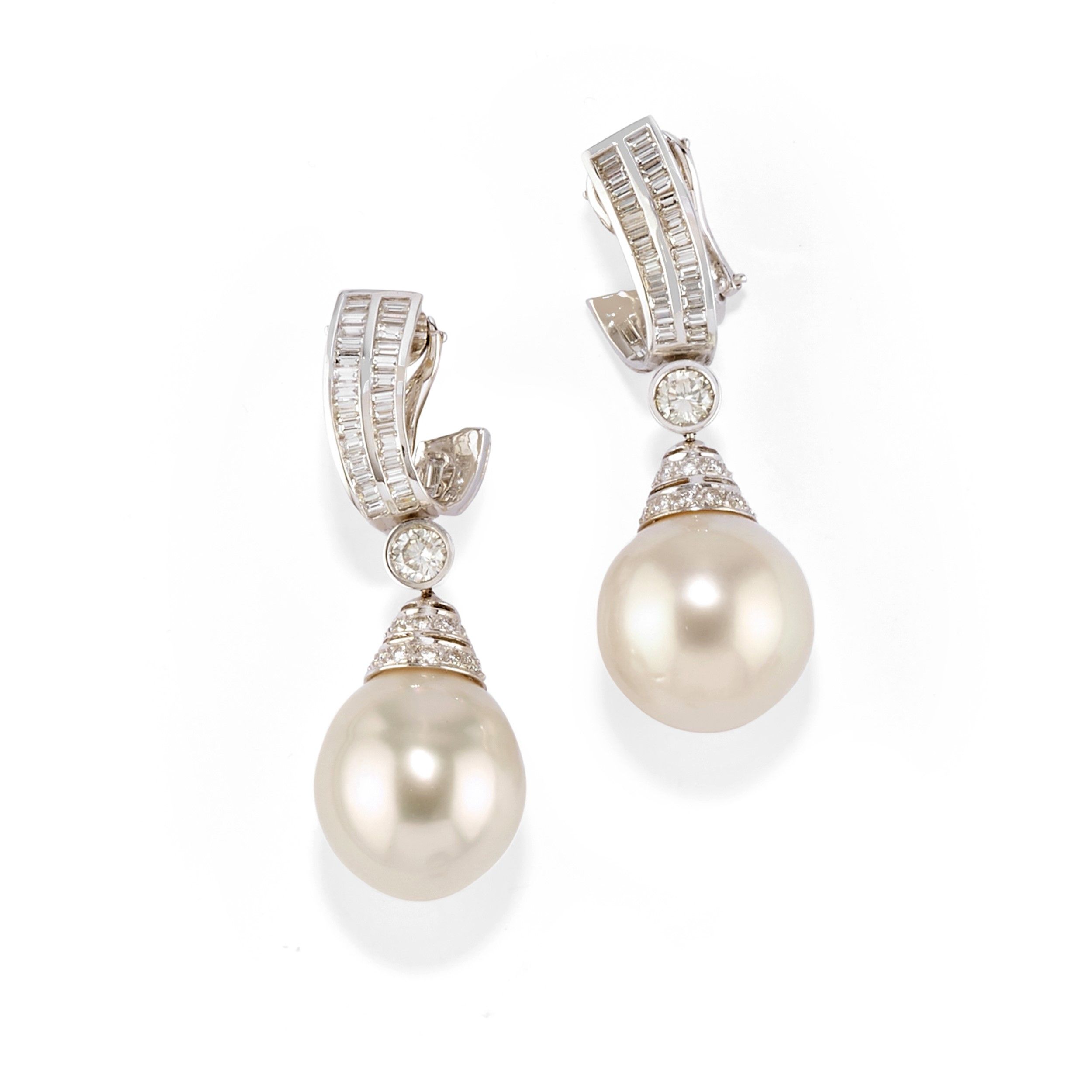 impreziositi da diamanti taglio baguette e brillante per totale ct 2,80 circa e perle South-Sea di mm 18,00 circa, chiusura perno e clip.