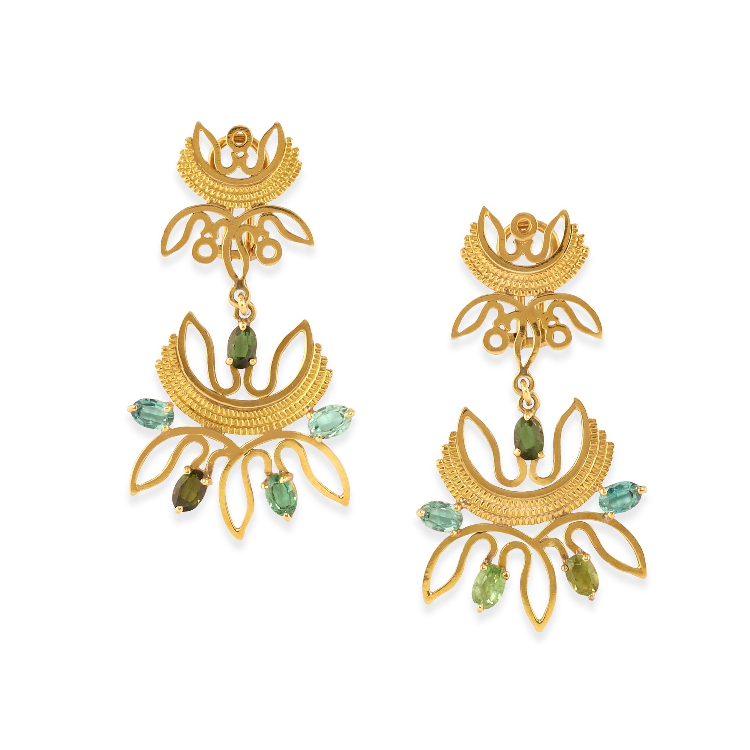 realizzati a doppio corpo, con decoro in oro martellato, pietre dure multicolor taglio ovale, chiusura perno e clip.