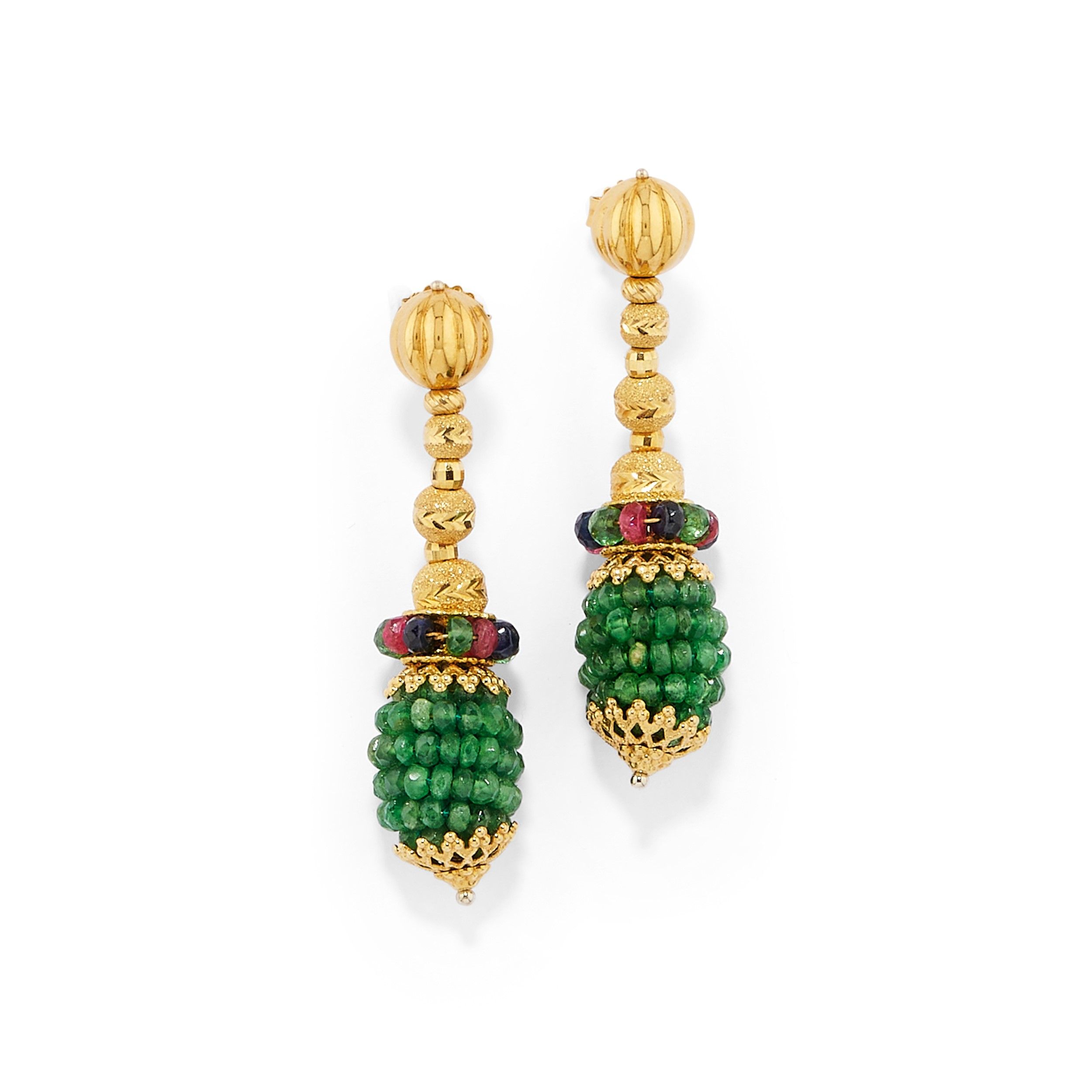 realizzati con motivi a barilotti incisi e beads di smeraldi, rubini e zaffiri, chiusura perno e farfalla.