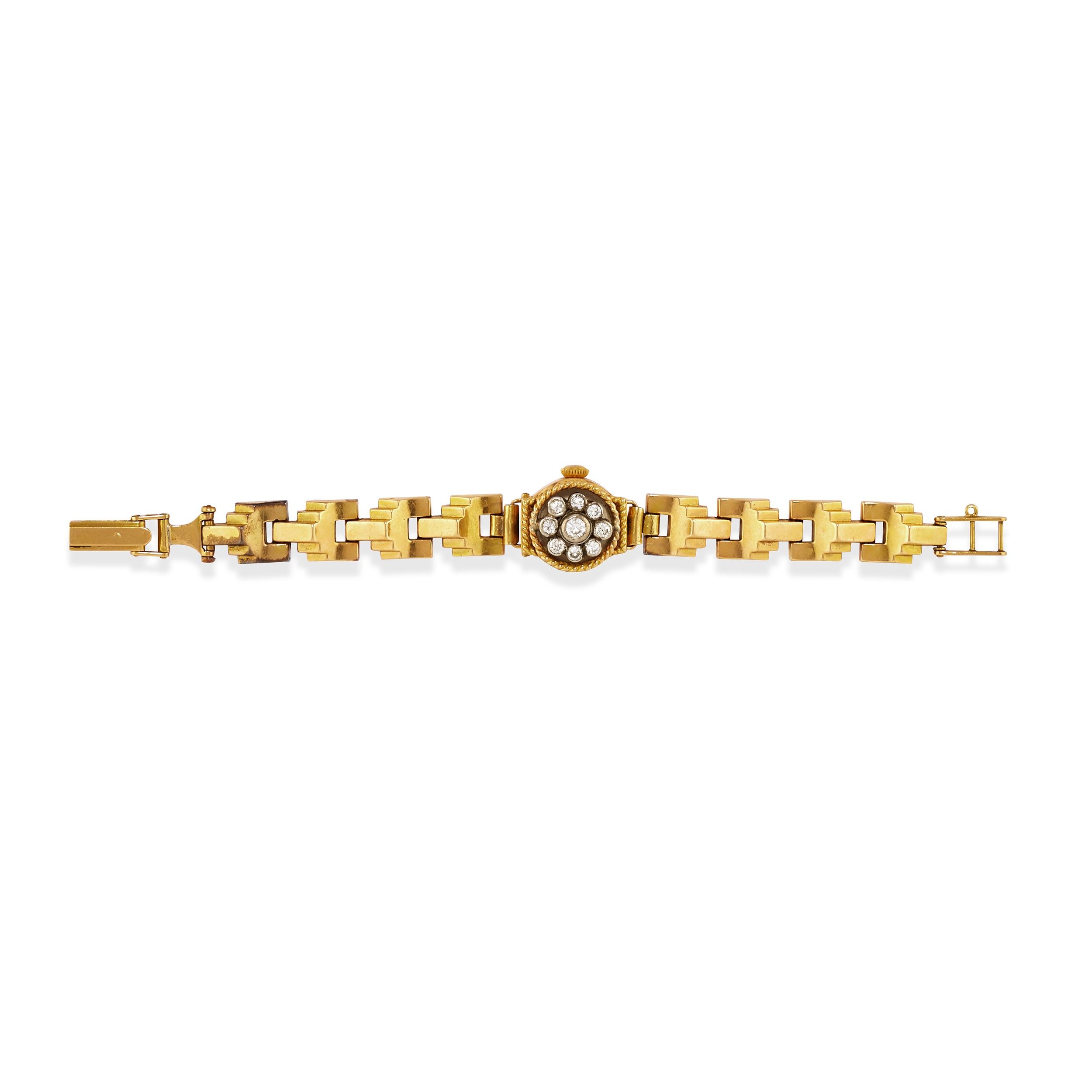cassa rotonda, quadrante chiaro con indici e numeri arabi applicati, copri cassa impreziosito da diamanti taglio rotondo, difetti (non funzionante).
