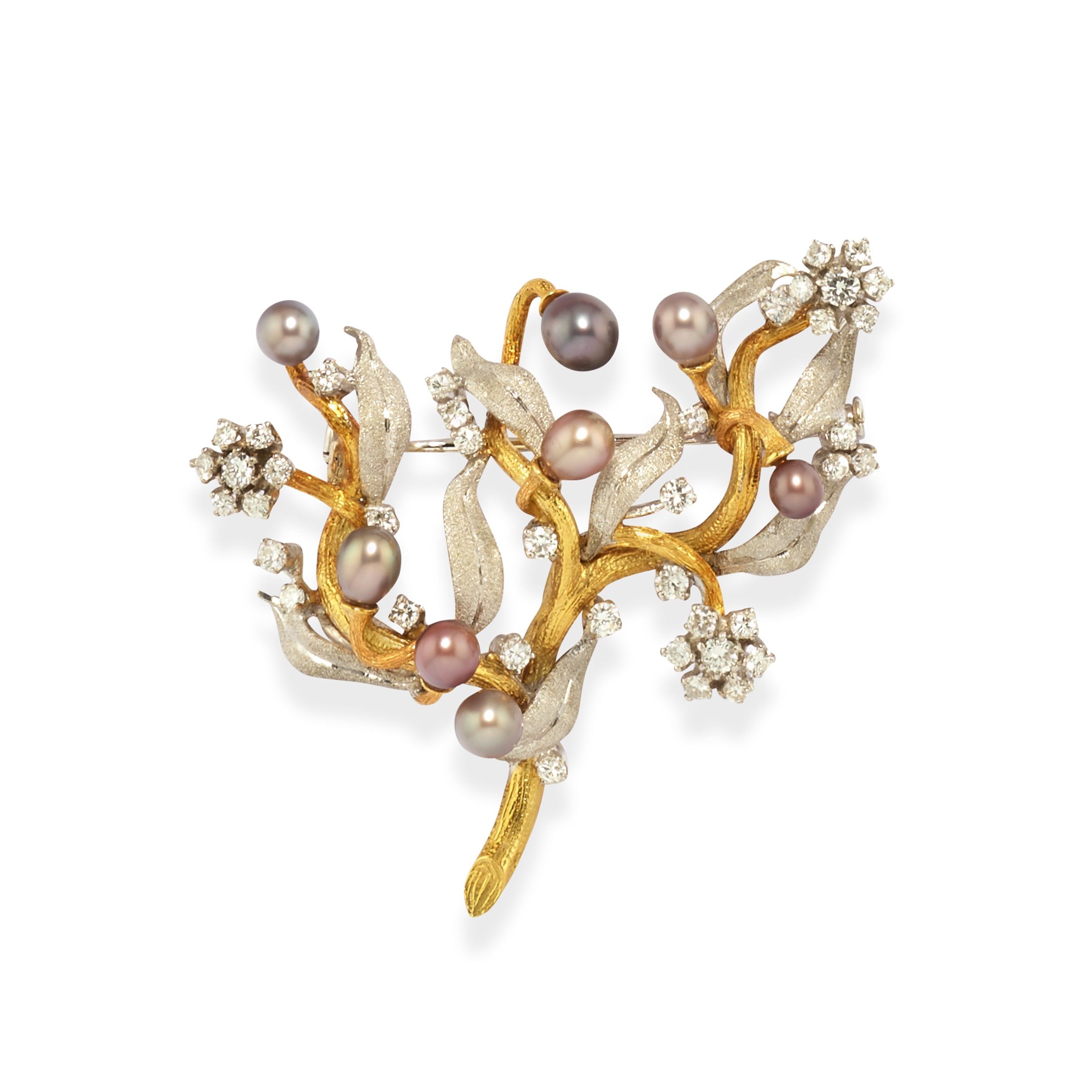 di gusto floreale, con perle coltivate e diamanti taglio brillante, fiori disposti su perni girevoli.