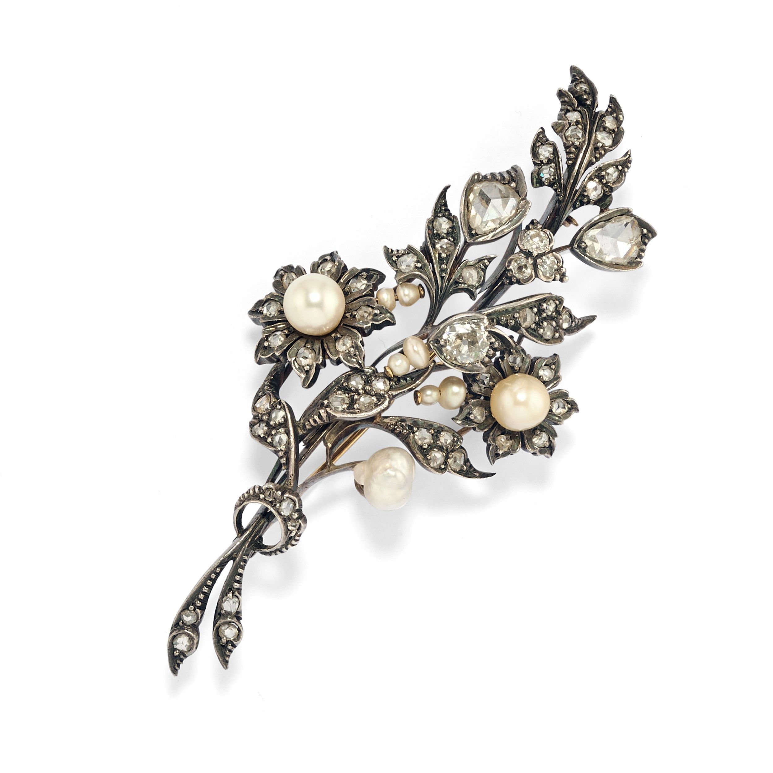 a ramage, decorata con diamanti taglio vecchio e rosa e perle coltivate.