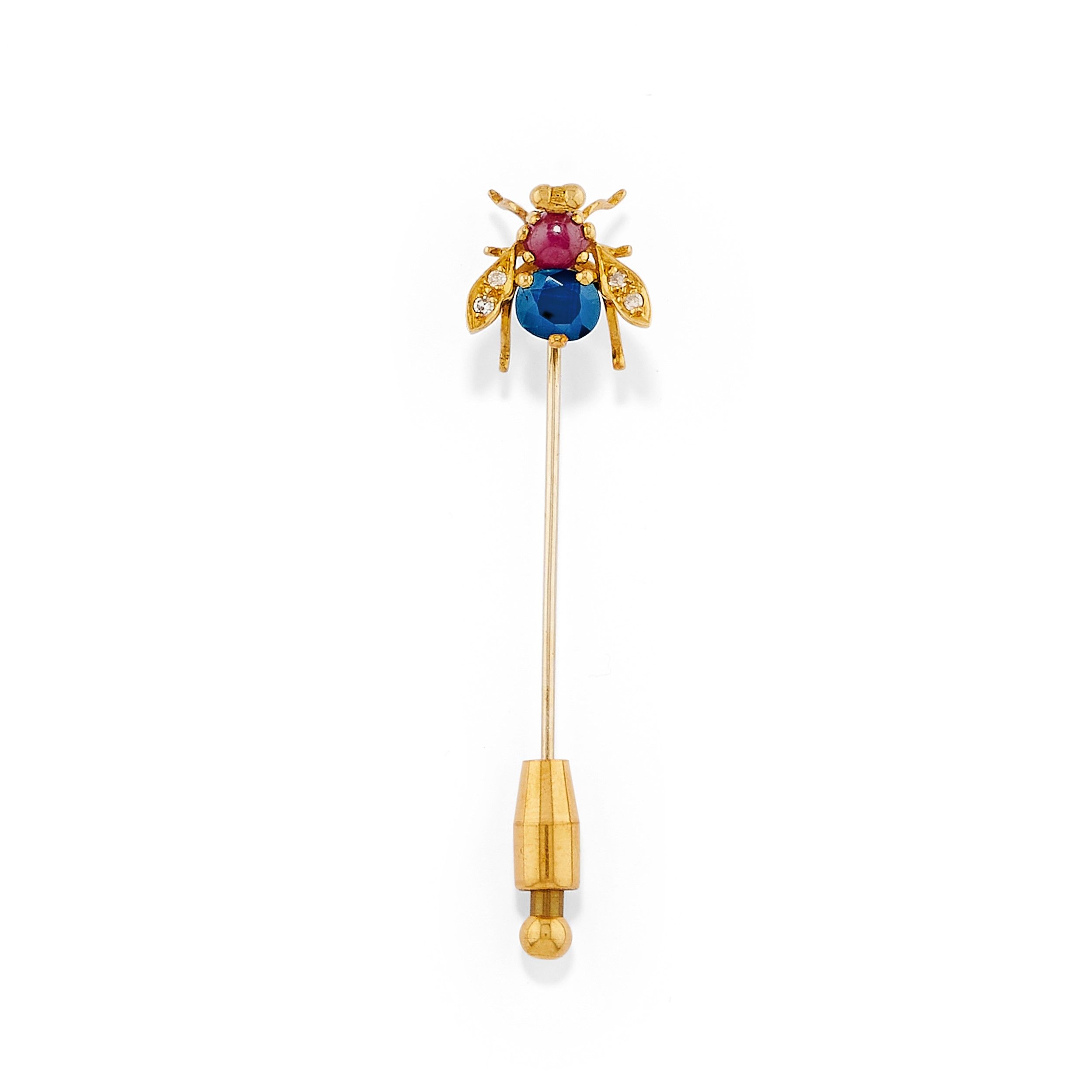 decorata da zaffiro taglio ovale, rubino taglio ovale cabochon e ali in piccoli diamanti taglio huit-huit, chiusura in metallo dorato.