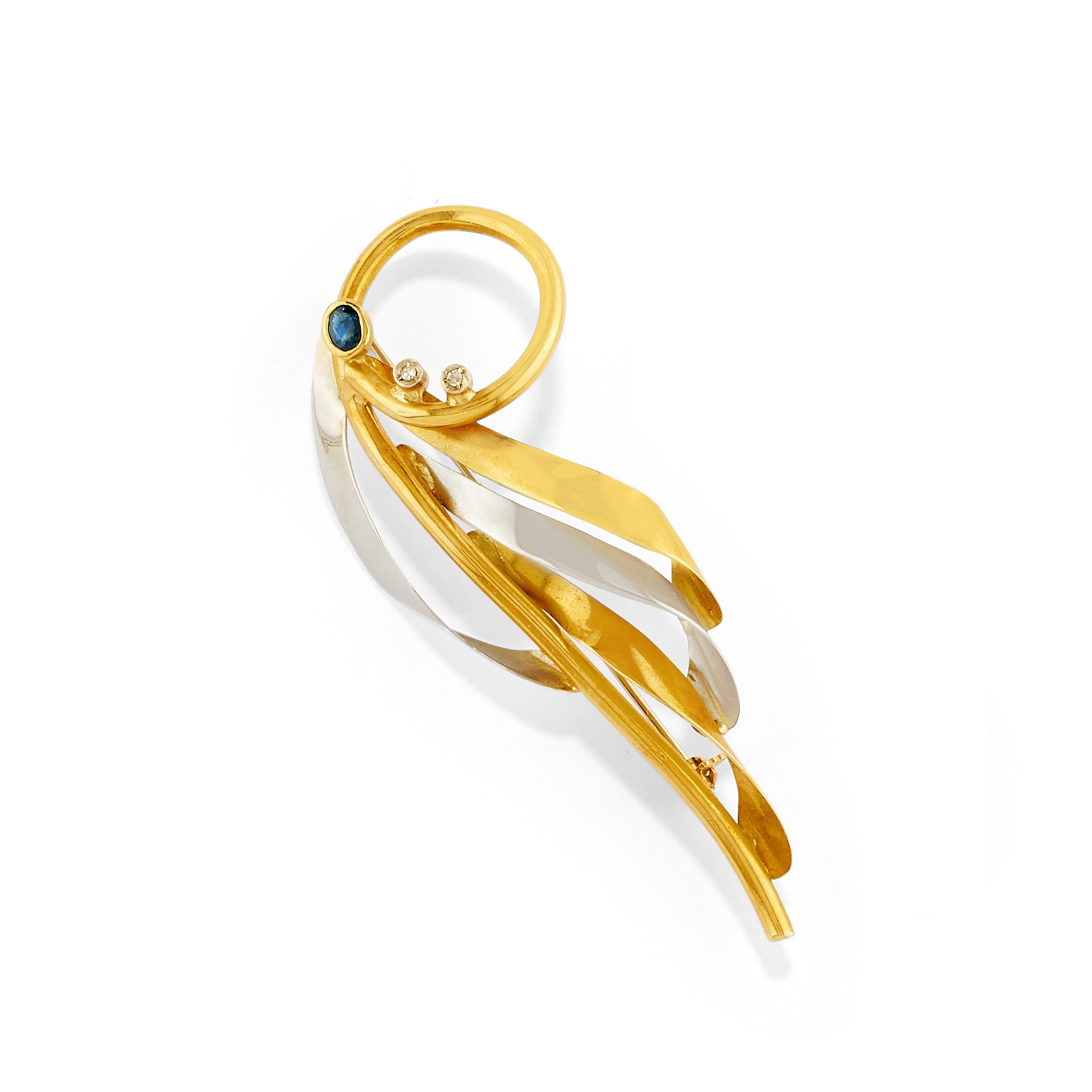 a volute, zaffiro taglio ovale e due diamanti taglio huit-huit.